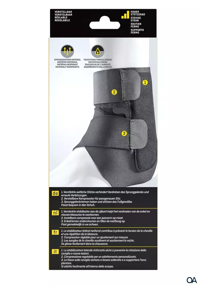 - Verstärkte seitliche Stütze verhindert Verdrehen des Sprunggelenks und erneute Verletzungen