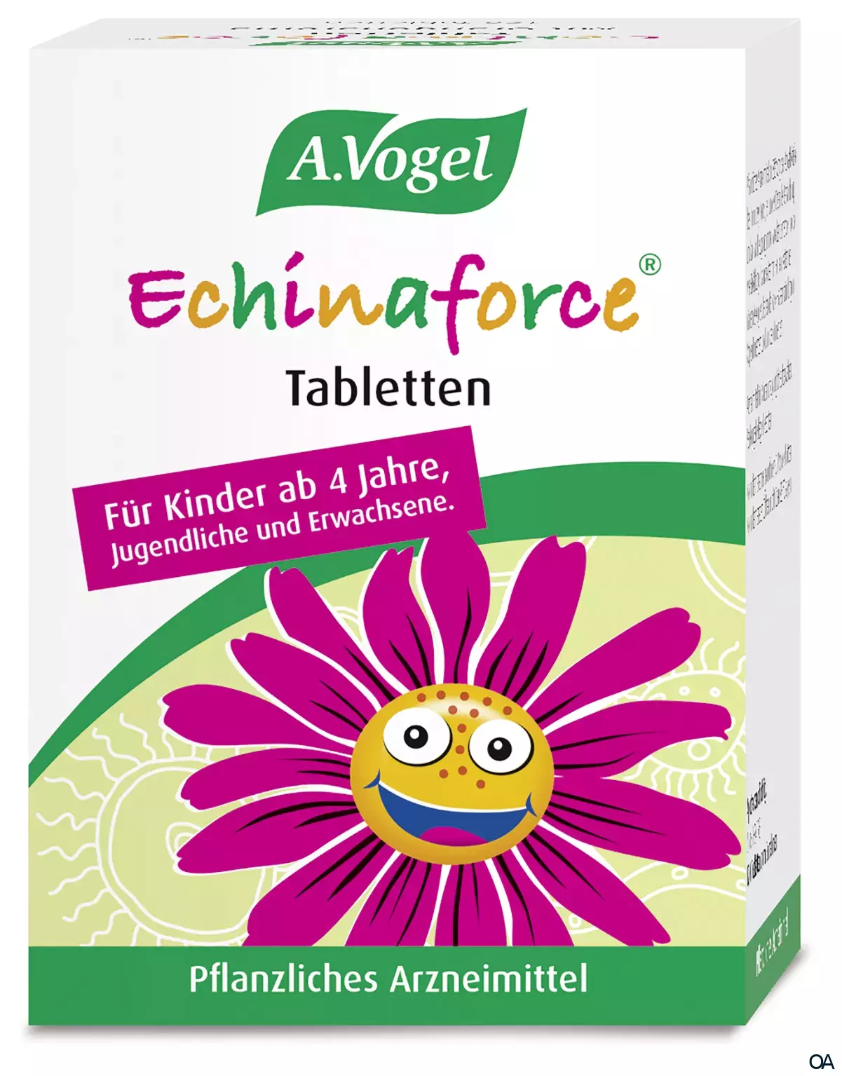 A.Vogel Echinaforce® Tabletten ist ein pflanzliches Arzneimittel zur Stärkung der Abwehrkräfte des Immunsystems, als unterstützende Behandlung und zur Vorbeugung immer wieder kehrender Infekte wie Erkältungskrankheiten mit Husten, Katarrhe, tränende Augen, laufende Nase, Halsentzündungen, Kopfschmerzen und Muskelschmerzen.