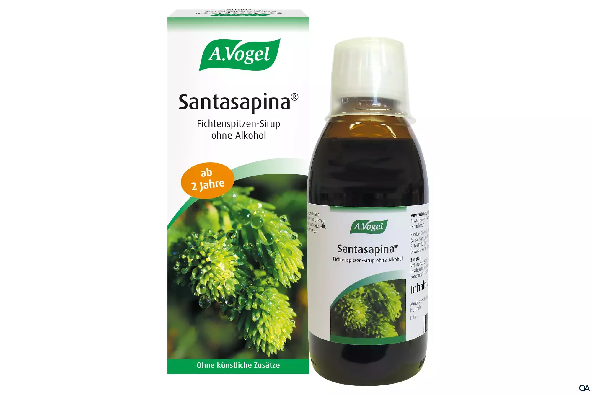 Der A.Vogel Santasapina Fichtenspitzen-Sirup ohne Alkohol wirkt wohltuend für Hals und Rachen. Geeignet für Kinder ab 2 Jahren.