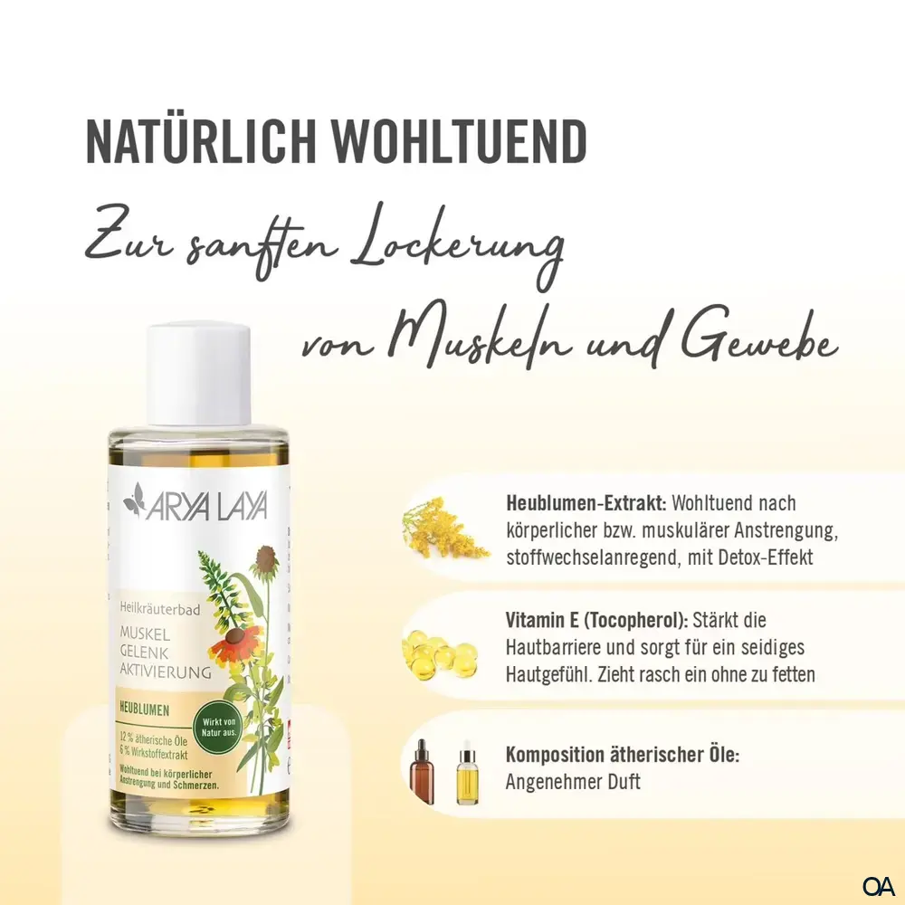 Erleben Sie die wohltuende, aktivierende Kraft traditioneller Heublumen im ARYA LAYA Heilkräuterbad. Ideal zur Entspannung nach körperlicher Anstrengung oder einfach für eine revitalisierende Auszeit.