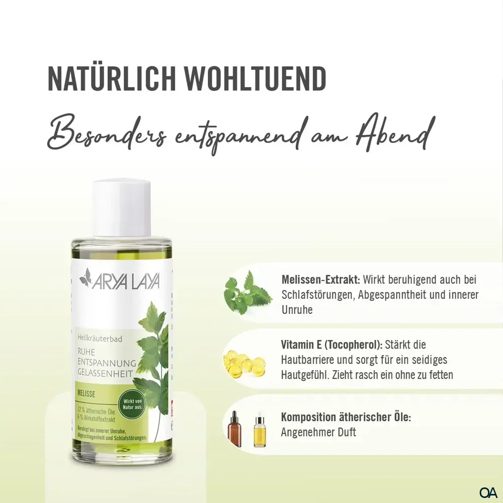 Entdecken Sie das beruhigende ARYA LAYA Heilkräuterbad Melisse. Es ist perfekt, um nach einem anstrengenden Tag zur Ruhe zu kommen und Stress abzubauen. Die natürlichen Extrakte der Melisse fördern tiefes Wohlbefinden und eine entspannte Nachtruhe. Ideal für Ihr Abendritual!