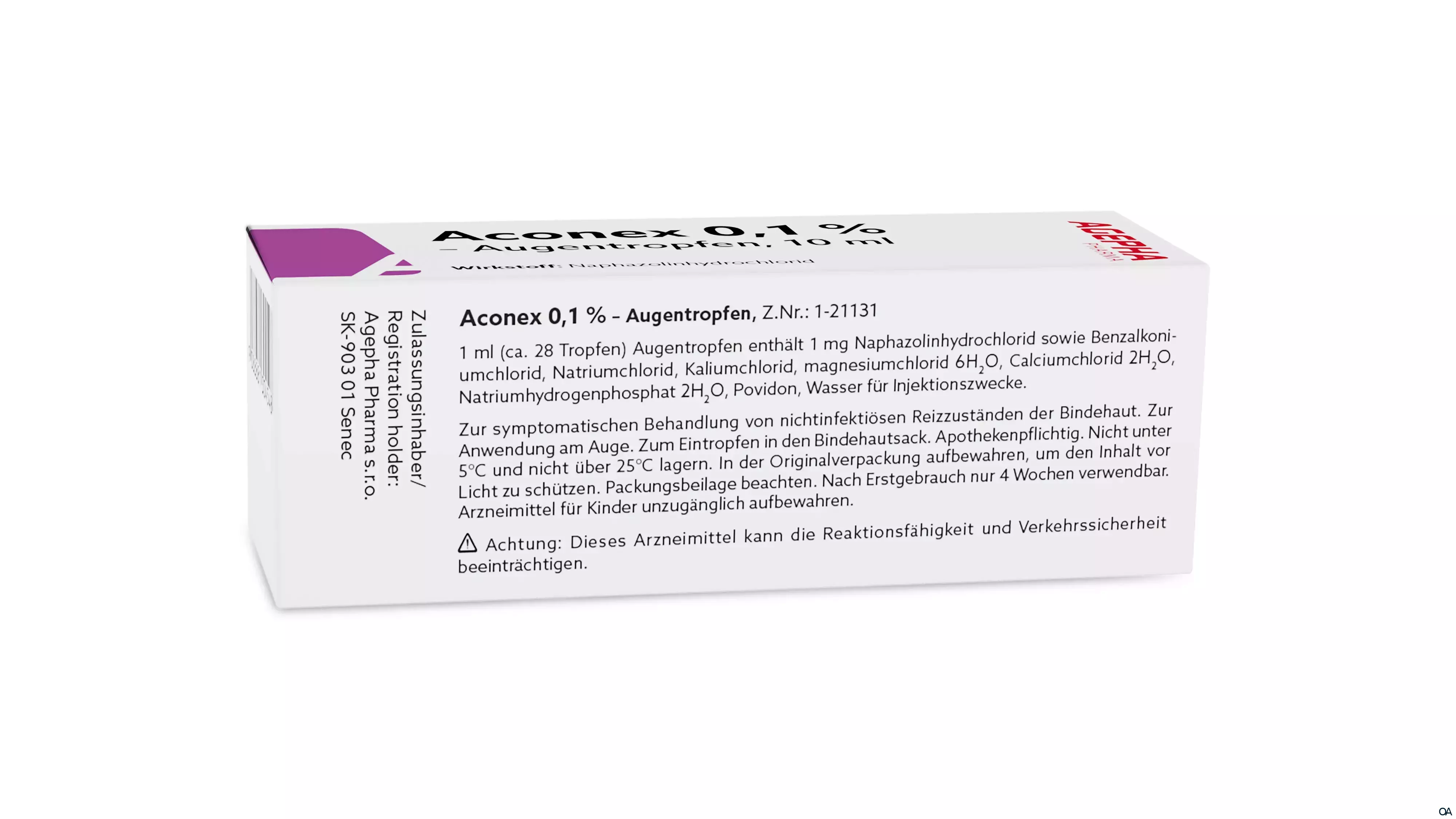 ACONEX Augentropfen enthalten als wirksamen Bestandteil Naphazolin, welches die Bindehaut abschwellen lässt und nicht bakterielle Bindehautentzündungen hemmt. Wenn Sie sich nach 2 Tagen Behandlung nicht besser oder gar schlechter fühlen, wenden Sie sich an Ihren Arzt.
