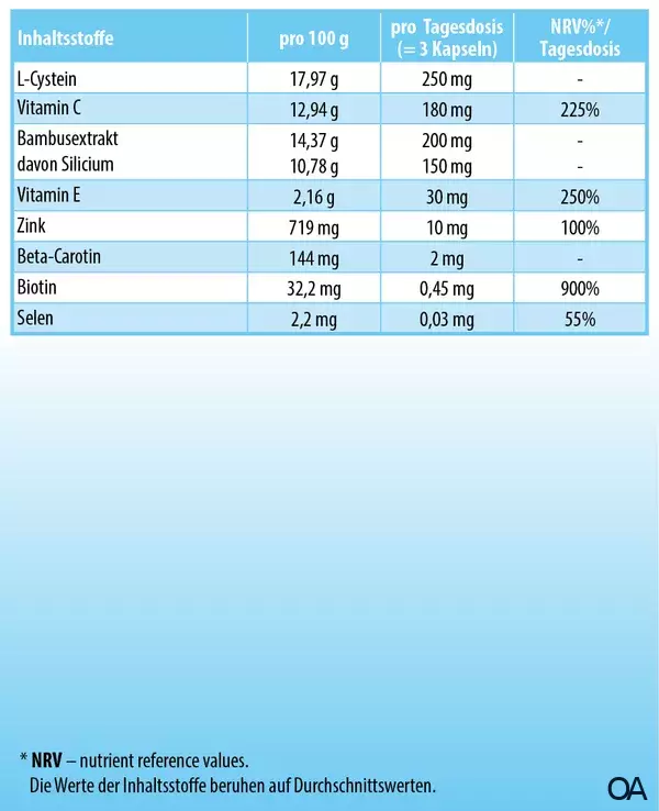 L-Cysteinhydrochlorid, Kapselhülle Hydroxypropylmethylcellulose, Vitamin C, Bambusextrakt, Erbsenfasern, Zinkgluconat, Vitamin E, Maltodextrin, Mittelkettige Triglyceride aus Pflanzenöl, Beta Carotin, Farbstoff Chlorophyllin-Kupfer-Komplex, Biotin, Natriumselenat