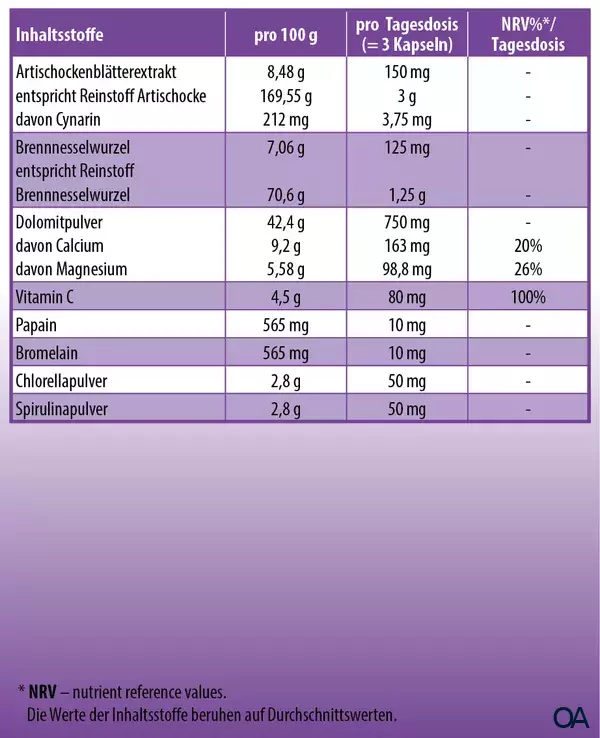 Dolomitpulver, Kapselhülle Hydroxypropylmethylcellulose, Erbsenfasern, Artischockenblätterextrakt, Brennnesselwurzelextrakt, Vitamin C, Chlorellapulver, Spirulinapulver, Mittelkettige Triglyceride aus Pflanzenöl, Papain, Bromelain, Farbstoff Chlorophyllin- Kupfer-Komplex