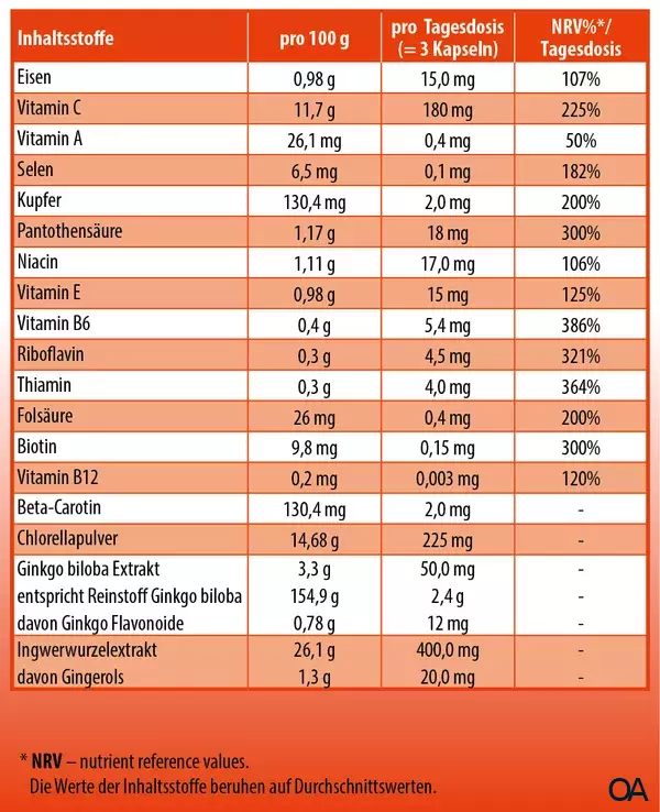Ingwerwurzelextrakt, Kapselhülle Hydroxypropylmethylcellulose, Chlorellapulver, Vitamin C, Eisengluconat, Maltodextrin, Gingko biloba Extrakt, Vitamin E, Mittelkettige Triglyceride aus Pflanzenöl, Beta Carotin, Pantothensäure, Niacin, Erbsenfasern, Kupfer-II-gluconat, Vitamin B6, Vitamin A, Thiamin, Riboflavin, Farbstoff Chlorophylin-Kupfer-Komplex, Folsäure, Natriumselenat, Biotin, Vitamin B12