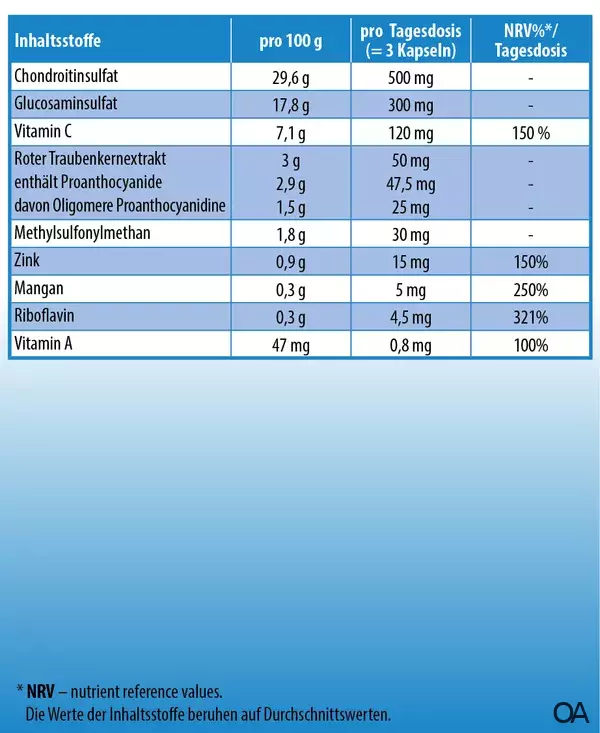 Chondroitinsulfat, Glucosaminsulfat aus Krebstieren, Kapselhülle Hydroxypropylmethylcellulose, Vitamin C, Zinkgluconat, Roter Traubenkernextrakt, Mangangluconat, Methylsulfonylmethan, Vitamin A, Mittelkettige Triglyceride aus Pflanzenöl, Riboflavin, Farbstoff Chlorophyllin-Kupfer-Komplex