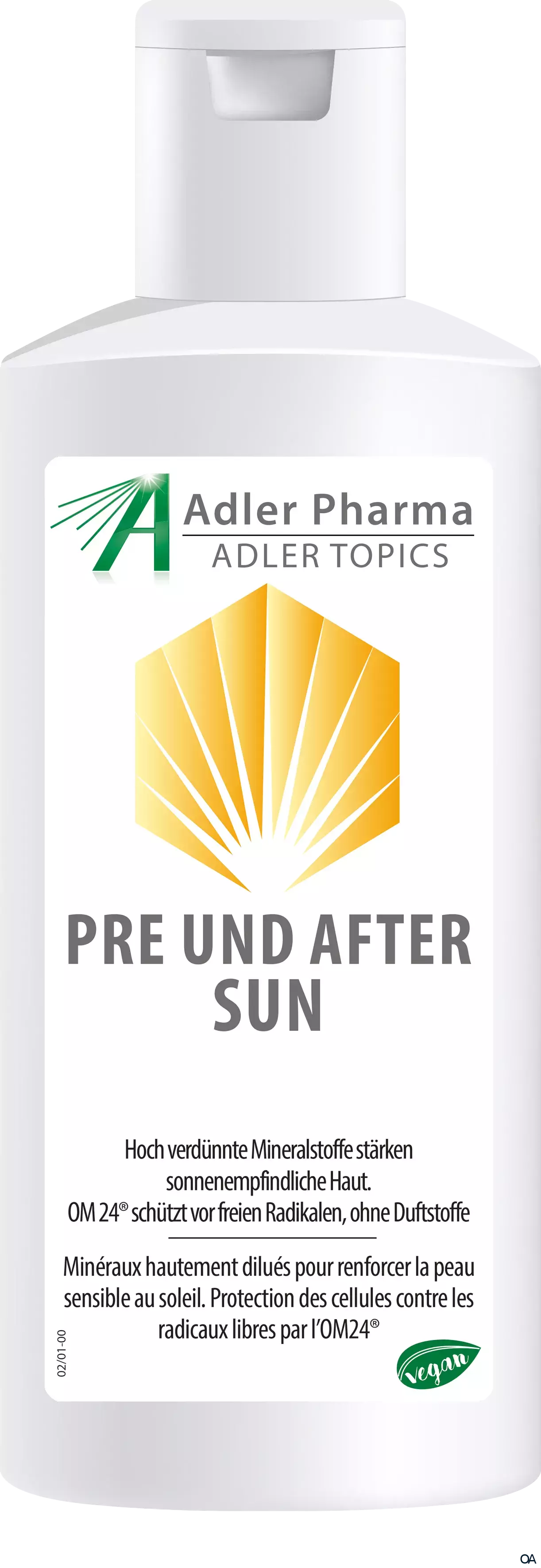 Das Adler Topics Pre und After Sun enthält hoch verdünnte Mineralstoffe zur Stärkung der sonnenempfindlichen Haut. Natürlicher 24-Stunden Zellschutz OM24 schützt vor Freien Radikalen.