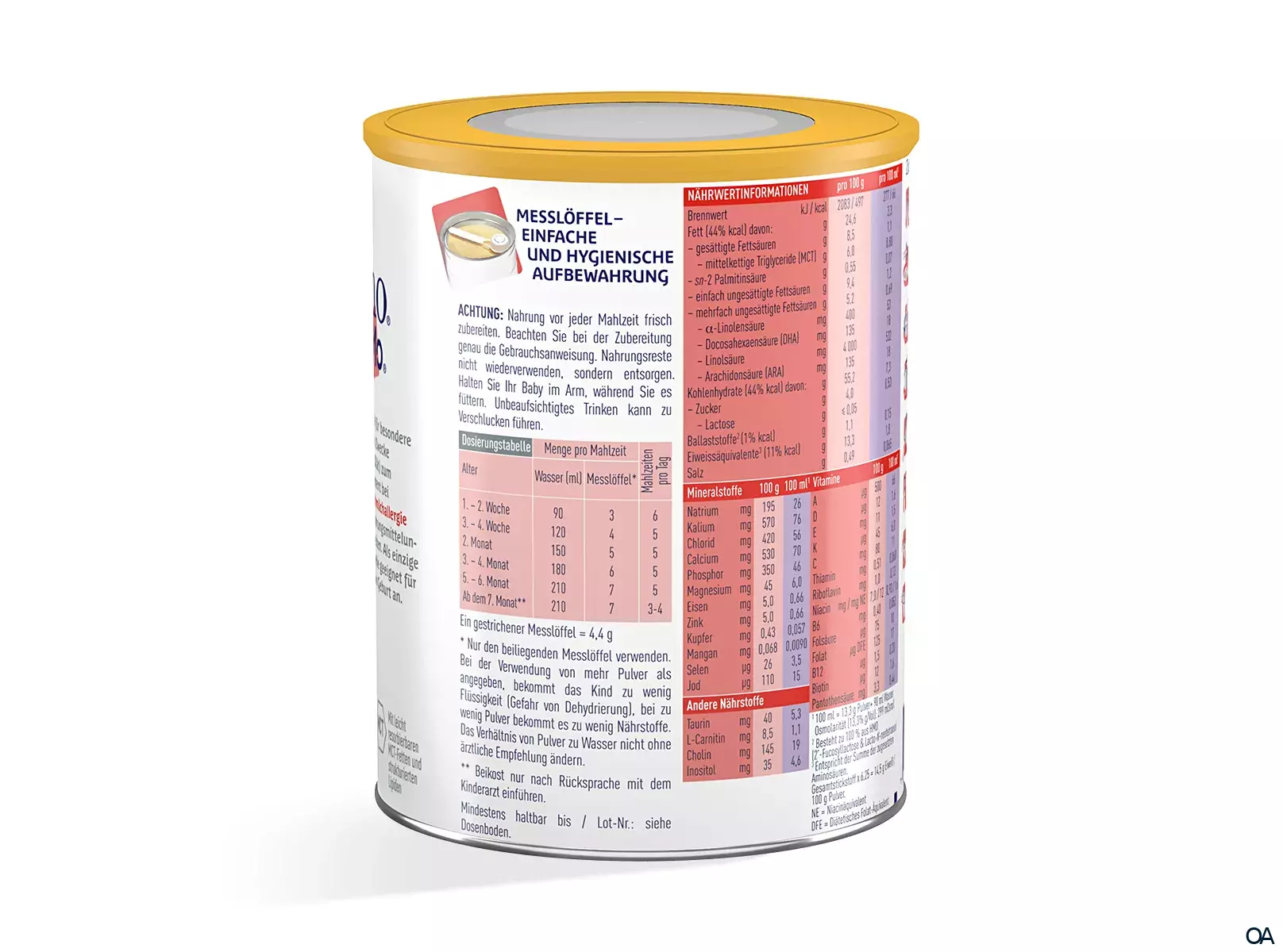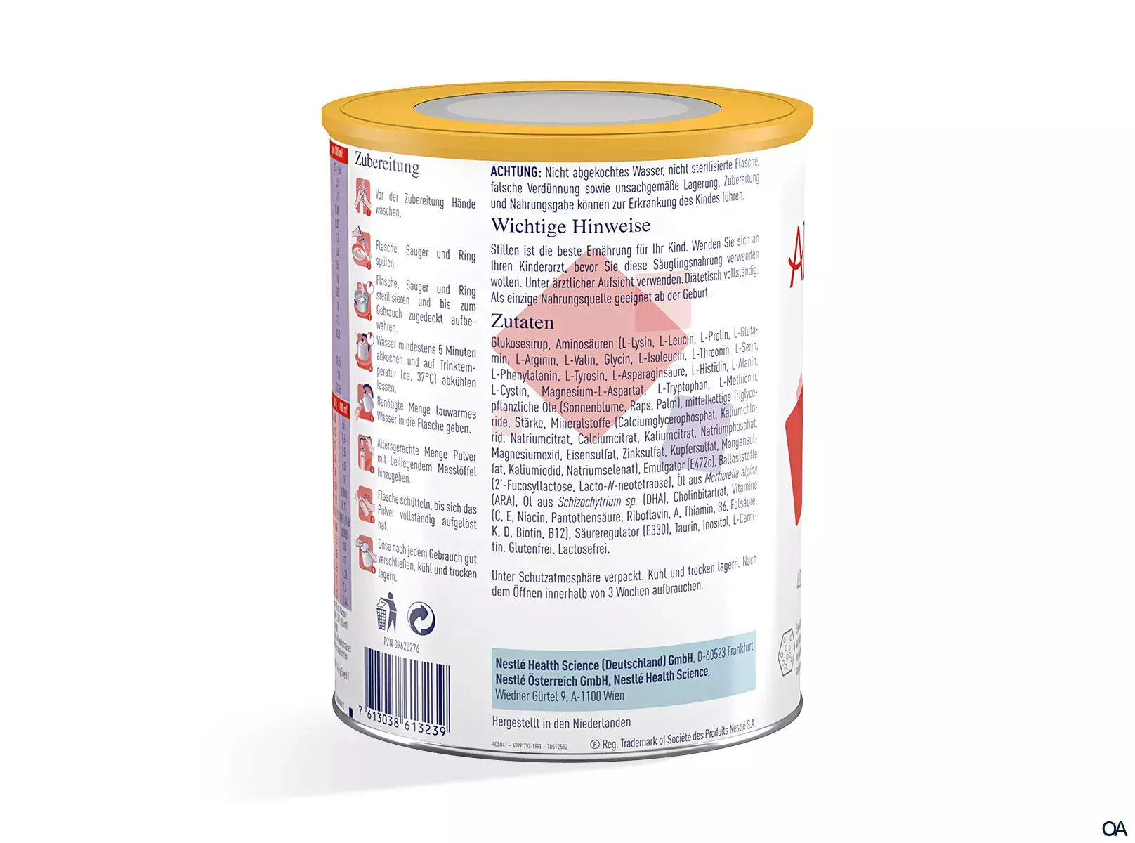 Glukosesirup, Aminosäuren (L-Lysin, L-Leucin, L-Prolin, LGlutamin, L-Arginin, L-Valin, Glycin, L-Isoleucin, L-Threonin, L-Serin, L-Phenylalanin, L-Tyrosin, L-Asparaginsäure, L-Histidin, L-Alanin, L-Cystin, Magnesium-L-Aspartat, L-Tryptophan, L-Methionin, pflanzliche Öle (Sonnenblume, Raps, Palm), mittelkettige Triglyceride, Stärke, Mineralstoffe (Calciumglycerophosphat, Kaliumchlorid, Natriumcitrat, Calciumcitrat, Kaliumcitrat, Natriumphosphat, Magnesiumoxid, Eisensulfat, Zinksulfat, Kupfersulfat, Mangansulfat, Kaliumiodid, Natriumselenat), Emulgator (E472c), Ballaststoffe (2’-Fucosyllactose, Lacto-N-neotetraose), Öl aus Mortierella alpina (ARA), Öl aus Schizochytrium sp. (DHA), Cholinbitartrat, Vitamine (C, E, Niacin, Pantothensäure, Riboflavin, A, Thiamin, B6, Folsäure, K, D, Biotin, B12), Säureregulator (E330), Taurin, Inositol, L-Carnitin. Glutenfrei. Lactosefrei. Unter Schutzatmosphäre verpackt.