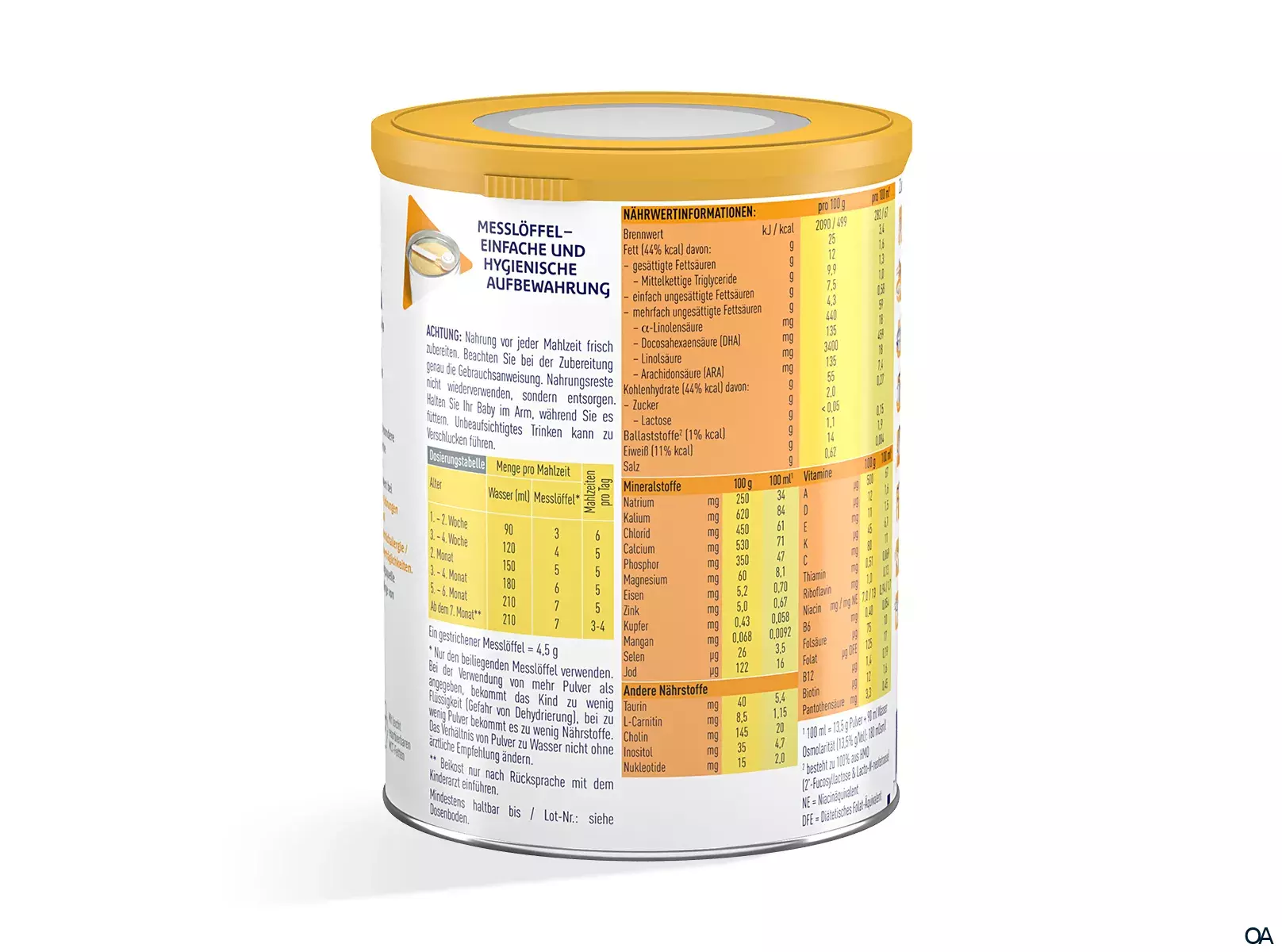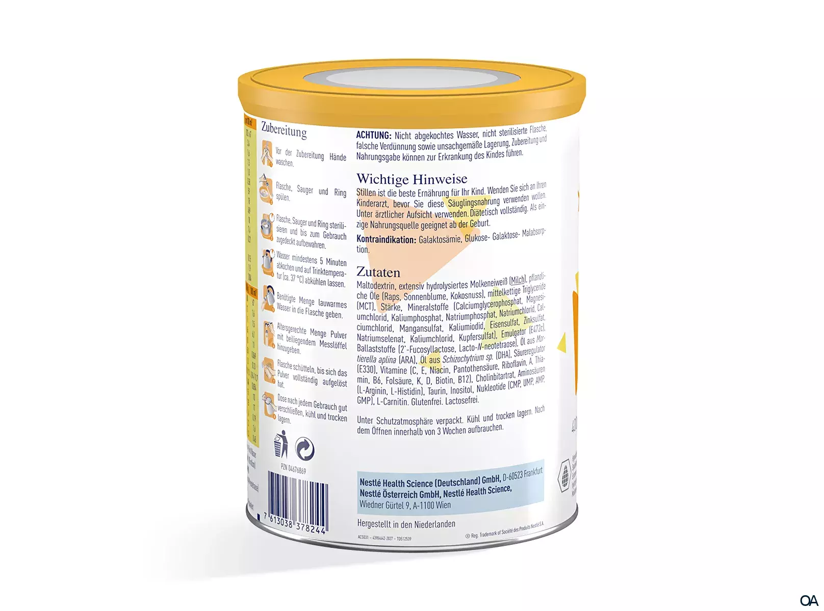 Maltodextrin, extensiv hydrolysiertes Molkeneiweiß (Milch), pflanzliche Öle (Raps, Sonnenblume, Kokosnuss), mittelkettige Triglyceride (MCT), Stärke, Mineralstoffe (Calciumglycerophosphat, Magnesiumchlorid, Kaliumphosphat, Natriumphosphat, Natriumchlorid, Calciumchlorid, Mangansulfat, Kaliumiodid, Eisensulfat, Zinksulfat, Natriumselenat, Kaliumchlorid, Kupfersulfat), Emulgator (E472c), Ballaststoffe (2’-Fucosyllactose, Lacto-N-neotetraose), Öl aus Mortierella aplina (ARA), Öl aus Schizochytrium sp. (DHA), Säureregulator (E330), Vitamine (C, E, Niacin, Pantothensäure, Riboflavin, A, Thiamin, B6, Folsäure, K, D, Biotin, B12), Cholinbitartrat, Aminosäuren (L-Arginin, L-Histidin), Taurin, Inositol, Nukleotide (CMP, UMP, AMP, GMP), L-Carnitin. Glutenfrei. Lactosefrei. Allergene: Milch