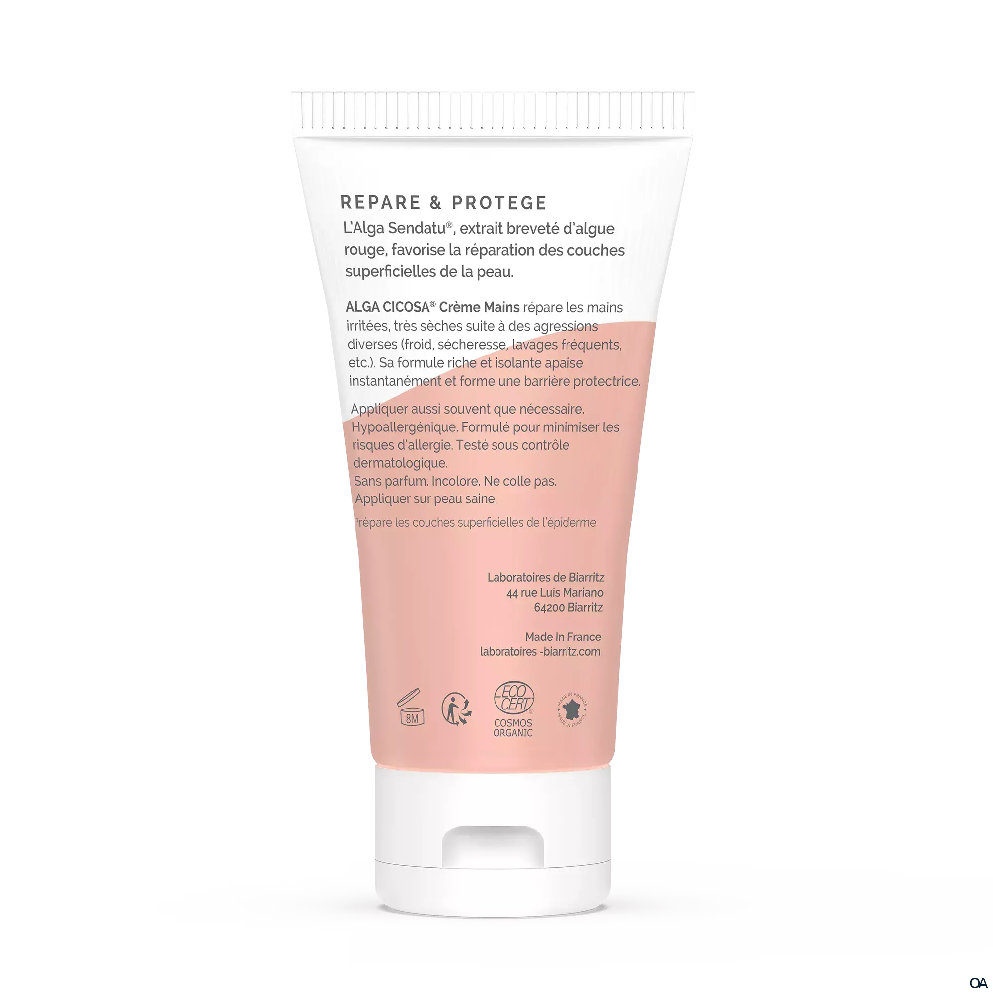 Die bio-handcreme ALGA CICOSA® regeneriert empfindliche, gereizte oder sehr trockene Hände, die durch Kälte, Trockenheit, häufiges Händewaschen strapaziert wurden. Gleich beim Auftragen beruhigt sich die Haut und wird weich und sanft. Dank der reichhaltigen und isolierenden Wirkung stärkt die Handcreme den Säureschutzmantel und bildet einen Schutzfilm. Die hypoallergene2 Formel enthält Alga-Sendatu®. Dieser regenerierende, patentierte Wirkstoff aus der Natur stammt von der Rotalge, die ganz natürlich an den Stränden der baskischen Atlantikküste angespült wird. Sie fördert die Erneuerung der oberen Hautschichten.