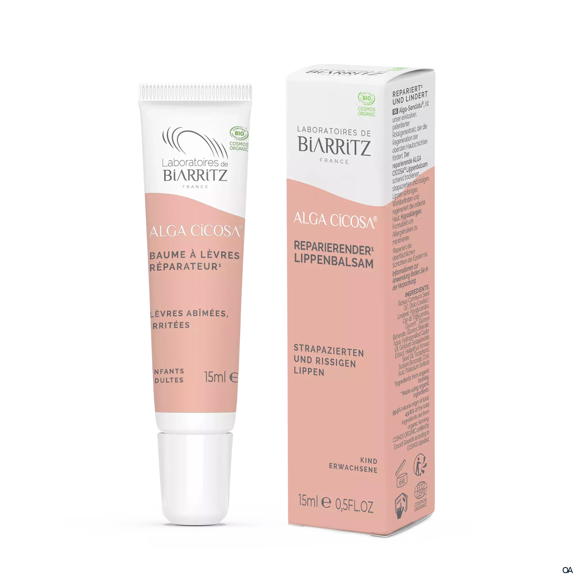 Der reparierende1 ALGA CICOSA® Lippenbalsam pflegt, schützt und regeneriert rissige, gereizte und strapazierte Lippen der gesamten Familie (Kinder & Erwachsene).