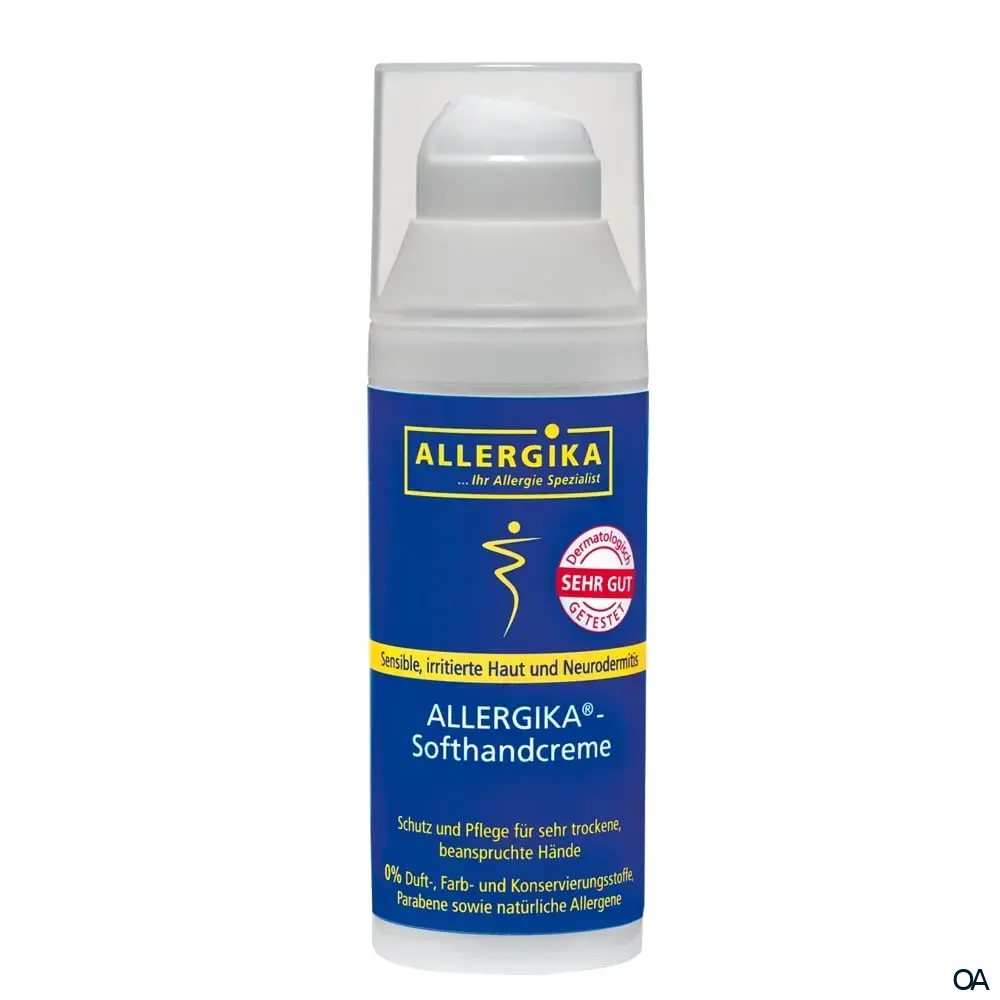 Allergika Softhandcreme mit 24 % Lipidanteil, Intensivpflege extrem empfindlicher, rauer, rissiger Haut an den Händen. Zur Vorbeugung von Waschekzemen und Hautirritationen.