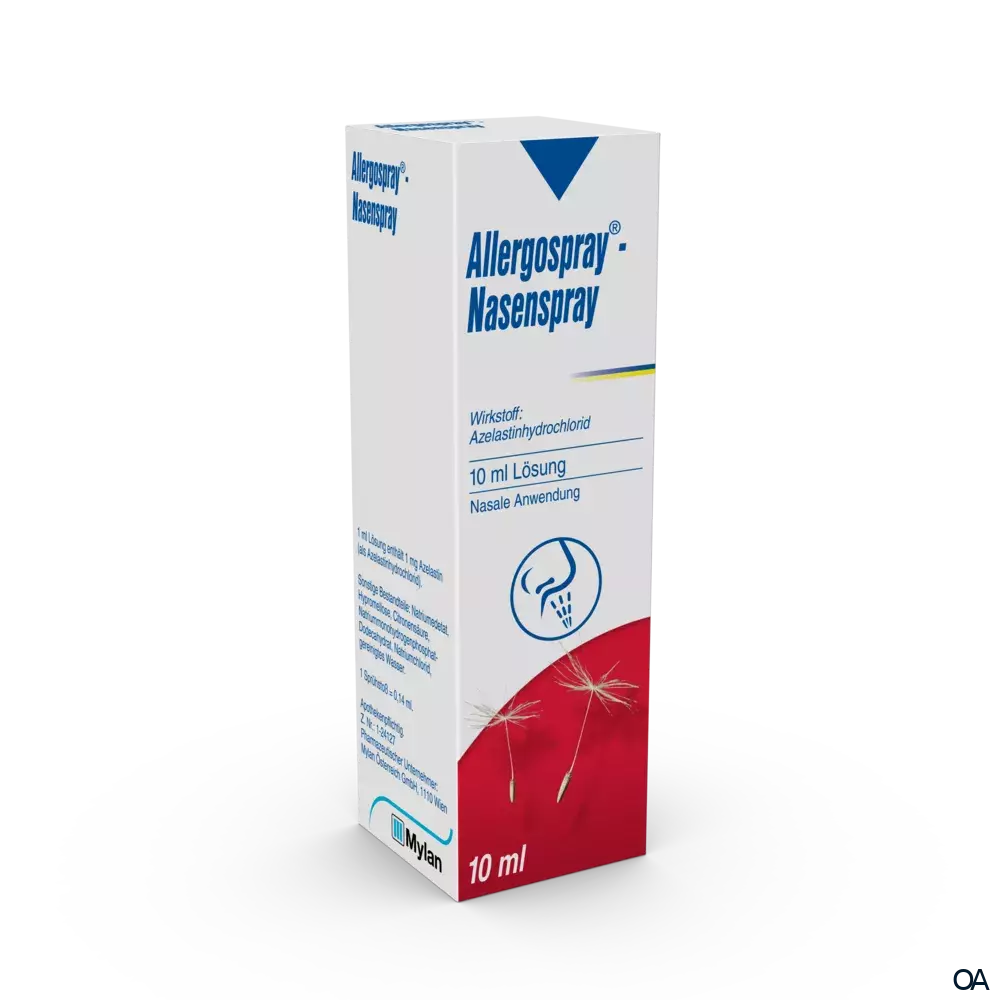 Allergospray ist ein Antiallergikum/Antihistaminikum. Der in Allergospray enthaltene Wirkstoff Azelastinhydrochlorid eignet sich zur lokalen Behandlung allergischer Symptome an der Nasenschleimhaut. Die Wirkung setzt rasch ein und hält über mehrere Stunden an.