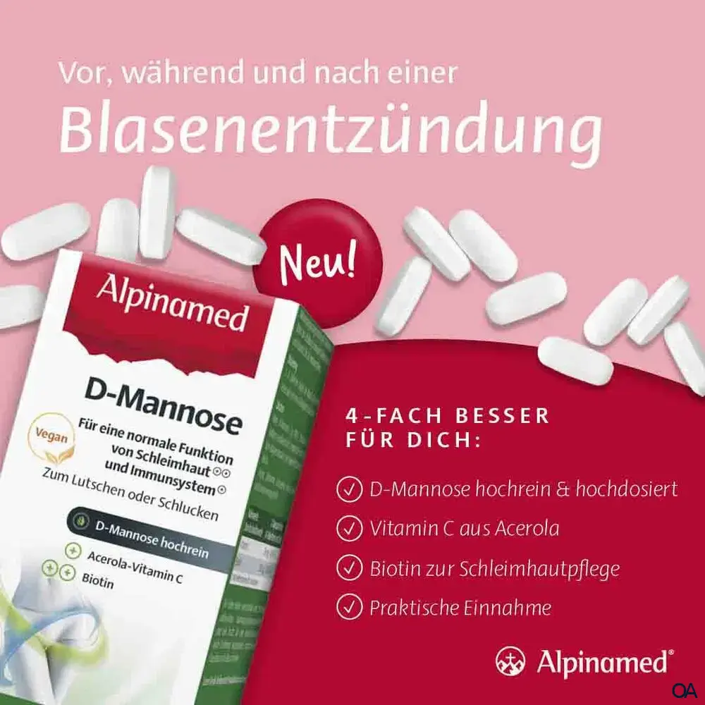 Die Alpinamed® D-Mannose + Biotin + Vitamin C Tabletten sind ein Nahrungsergänzungsmittel zur Anwendung, vor, während und nach einer Blasenentzündung: Zum Erhalt normaler Schleimhäute sowie zur Unterstützung von Immunsystem und Zellschutz.