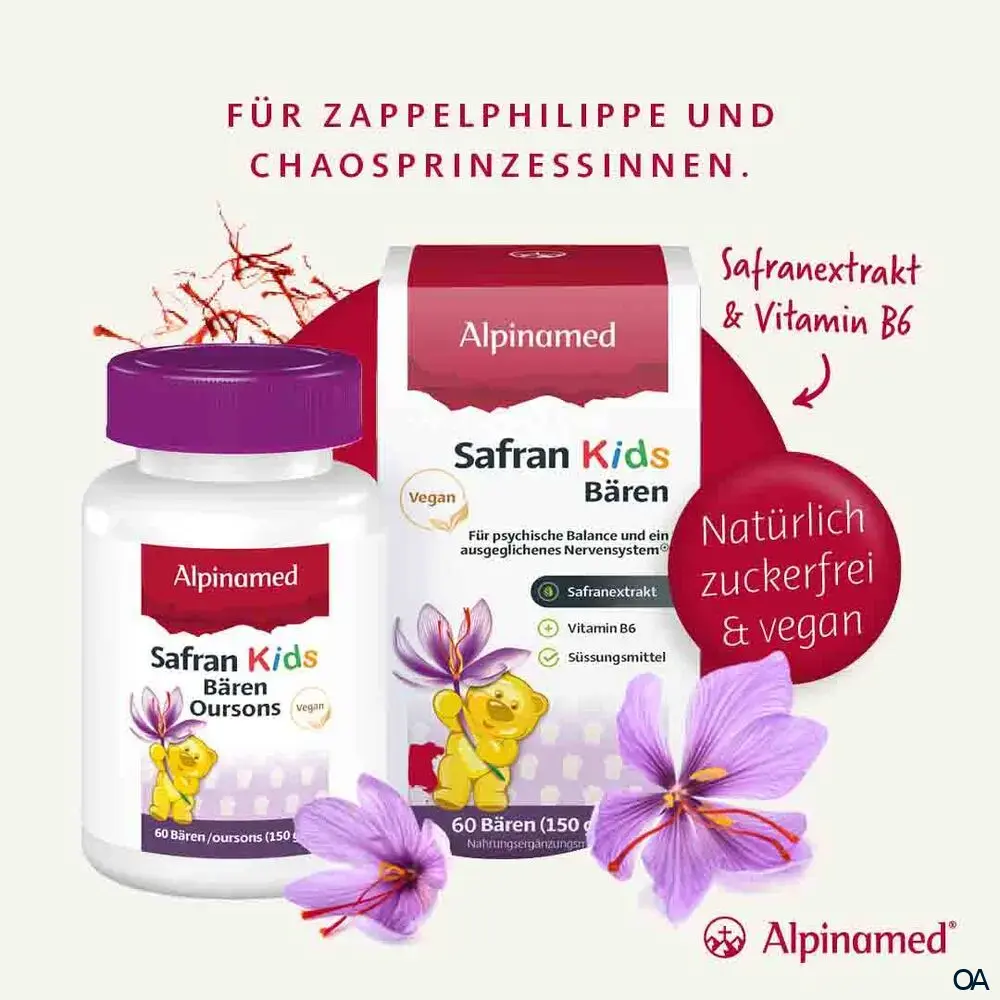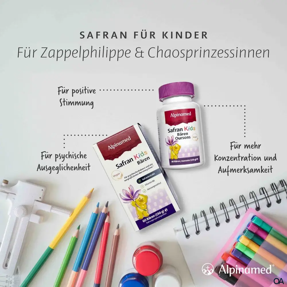 - Hinweise: Die empfohlene Tagesdosis sollte nicht überschritten werden. Die Einnahme von Alpinamed® Safran Kids Bären wir ausschließlich unter Aufsicht eines Erwachsenen und nicht für Kinder unter 4 Jahren empfohlen.