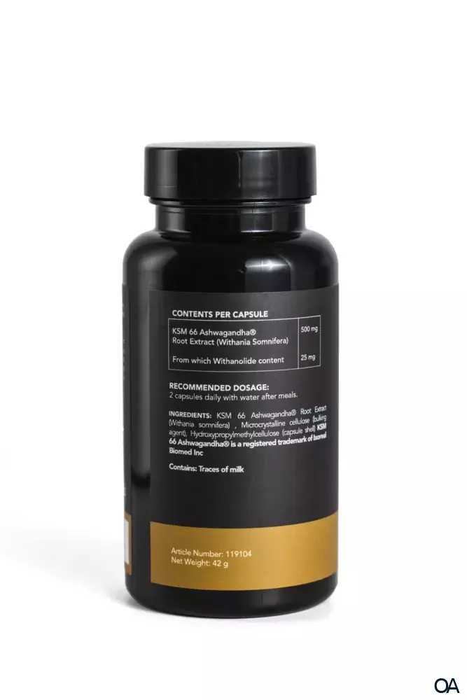 - Zusammensetzung pro Kapsel: KSM 66 Ashwagandha® Wurzelextrakt (Withania Somnifera) 500mg (/) davon Withanolidgehalt (5%) 25mg (/). (/): Keine NRV-Referenz verfügbar.