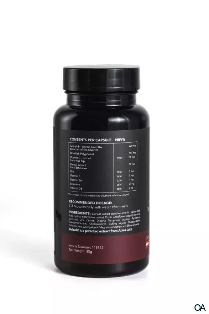 - Zusammensetzung pro Kapsel %NRV*: Belinal® – Extrakt aus den Zweigen der Weißtanne 220mg (/) davon reine Polyphenole 154mg (/), Vitamin C 50 mg (63%)*– aus Hagebuttenextrakt 50mg, Purpursonnenhut-Extrakt 50mg (/), Zink 5mg (50%)*, Vitamin E 2 mg (16%)*, Vitamin B6 1mg (72%)*, Selen 20 µg (36%)*, Vitamin D3 3 µg (60 %)* (/). Keine NRV-Referenz verfügbar ()*. Prozentsatz der täglichen Einnahme NRV.