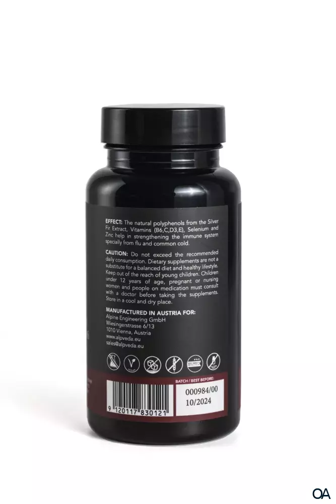 - Die immunitätssteigernden Kapseln der Alpveda Weißtanne basieren auf einer Formel aus drei natürlichen Extrakten, drei Vitaminen und zwei essentiellen Mineralien. Wissenschaftler haben im Weißtannenextrakt eine äußerst vielfältige Zusammensetzung aus 36 verschiedenen Polyphenolen entdeckt, die zu seinen antioxidativen Eigenschaften führt.