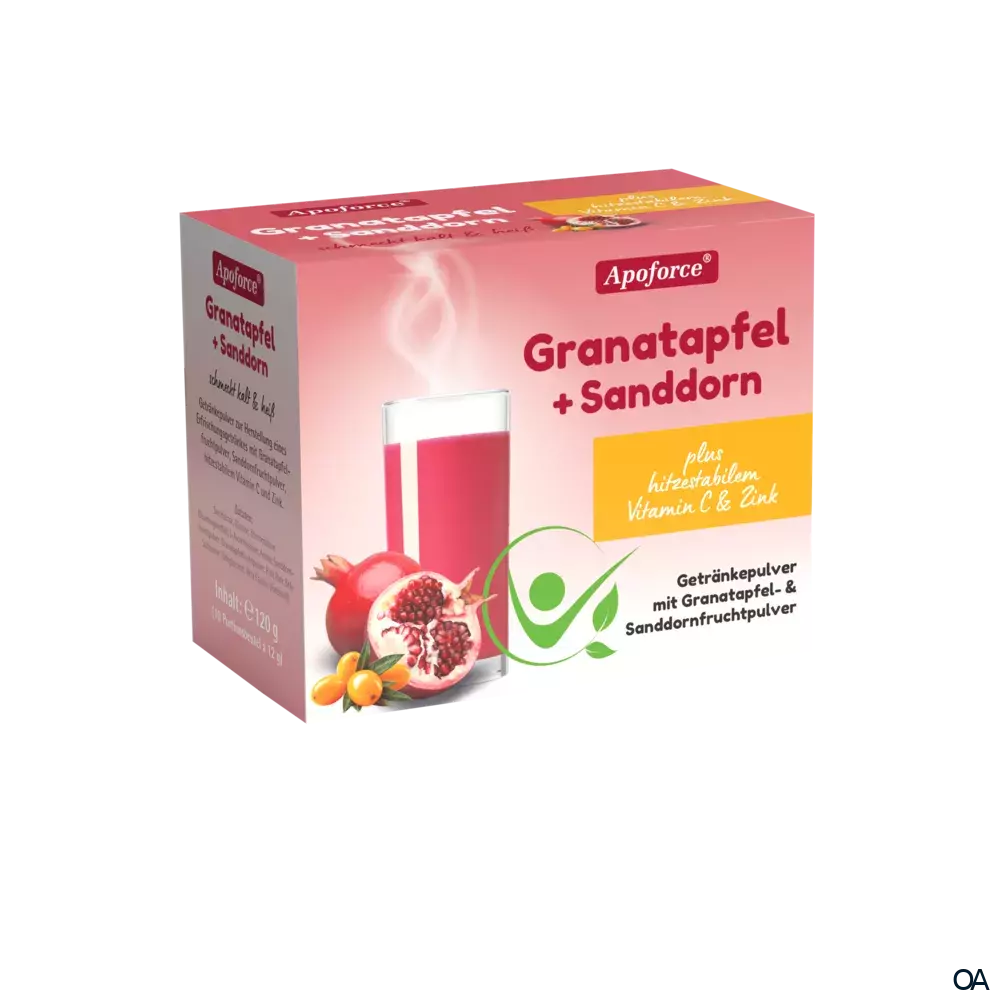 Apoforce® Granatapfel + Sanddorn Getränkepulver zur Herstellung eines Erfrischungsgetränks mit Granatapfelfruchtpulver, Sanddornfruchtpulver, hitzestabilem Vitamin C und Zink.