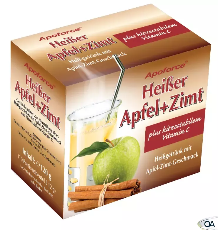 Apoforce® Heißer Apfel + Zimt ist ein Getränkepulver zur Herstellung eines Heißgetränkes mit Apfel-Zimt-Geschmack und hitzestabilem Vitamin C.