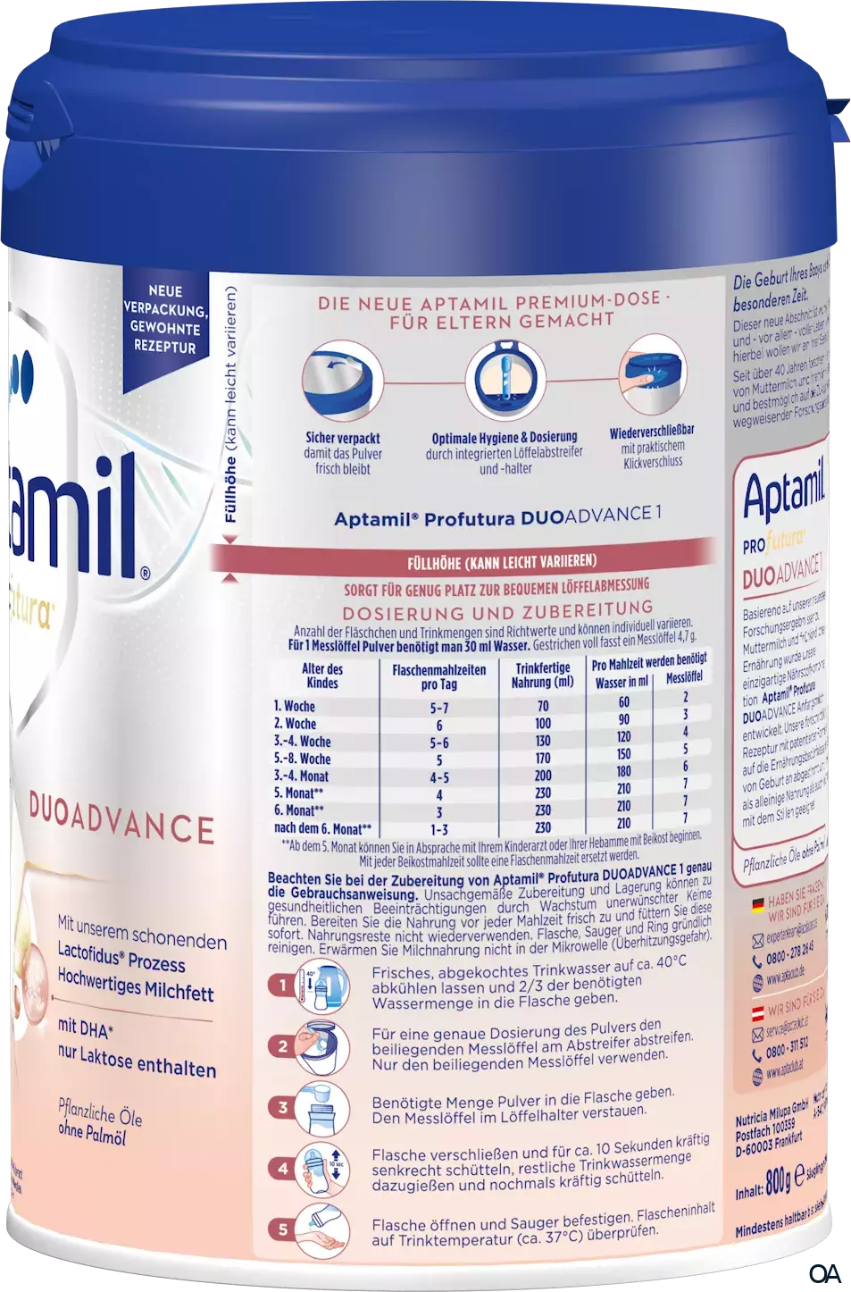 - Beachte bei der Zubereitung das richtige Dosierungsverhältnis laut Tabelle. Anzahl der Fläschchen und Trinkmengen sind Richtwerte und können individuell variieren. Der beiliegende Messlöffel fasst gestrichen voll 4,7 g Aptamil Profutura DUOADVANCE 1.