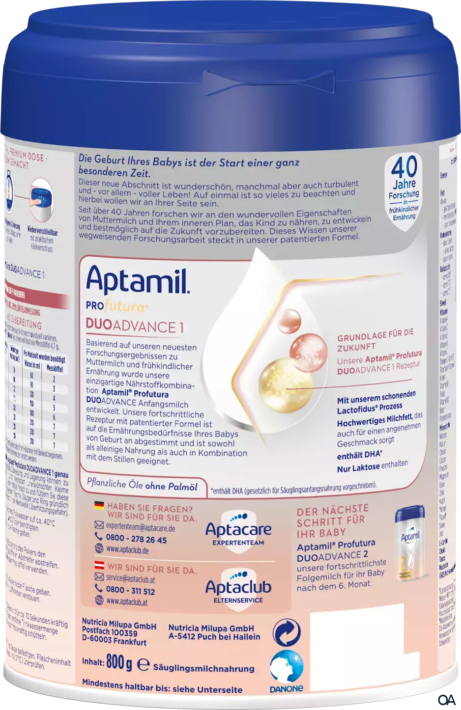Aptamil Profutura DUOADVANCE 1 enthält pflanzliche Öle ohne Palmöl, DHA* und nur Laktose.