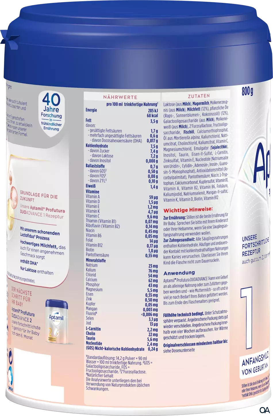 - Nährwerte pro 100 ml trinkfertige Nahrung¹: Energie kJ 285 kcal 68, Fett, davon: 3,5 g - gesättigte Fettsäuren 1,7 g - mehrfach ungesättigte Fettsäuren 0,6 g -- davon Docosahexaensäure (DHA) 0,017 g, Kohlenhydrate, davon: 7,5 g - Zucker 7,4 g -- davon Laktose 7,2 g - Inositol 0,008 g, Ballaststoffe, davon: 0,7 g - GOS² 0,50 g - FOS² 0,08 g - 2'FL³ 0,10 g, Eiweiß 1,4 g, Vitamin A 59 µg, Vitamin D 1,5 µg, Vitamin E 1,2 mg, Vitamin K 4,7 µg, Vitamin C 9,6 mg, Thiamin (Vitamin B₁) 0,07 mg, Riboflavin (Vitamin B₂) 0,14 mg, Niacin 0,45 mg, Vitamin B₆ 0,05 mg, Folat 14 µg, Vitamin B₁₂ 0,17 µg, Biotin 1,8 µg, Pantothensäure 0,55 mg, Natrium 23 mg, Kalium 76 mg, Chlorid 54 mg, Calcium 62 mg, Phosphor 43 mg, Magnesium 5,5 mg, Eisen 0,55 mg, Zink 0,50 mg, Kupfer 0,05 mg, Mangan 0,003 mg, Fluorid⁴ < 0,006 mg, Selen 3,1 µg, Jod 13 µg, L-Carnitin 2,2 mg, Cholin 22 mg, Taurin 5,6 mg, Nucleotide 2,4 mg, (GOS) Nicht-kalorische Kohelnhydrate 0,24 g. ¹ Standardauflösung: 14,2 g Pulver + 90 ml Wasser = 100 ml trinkfertige Nahrung. ² GOS = Galactooligosaccharide, FOS = Fructooligosaccharide. ³ 2'Fucosyllactose. ⁴ natürlicher Gehalt Die Analysewerte unterliegen den bei Verwendung von Naturprodukten üblichen Schwankungen.