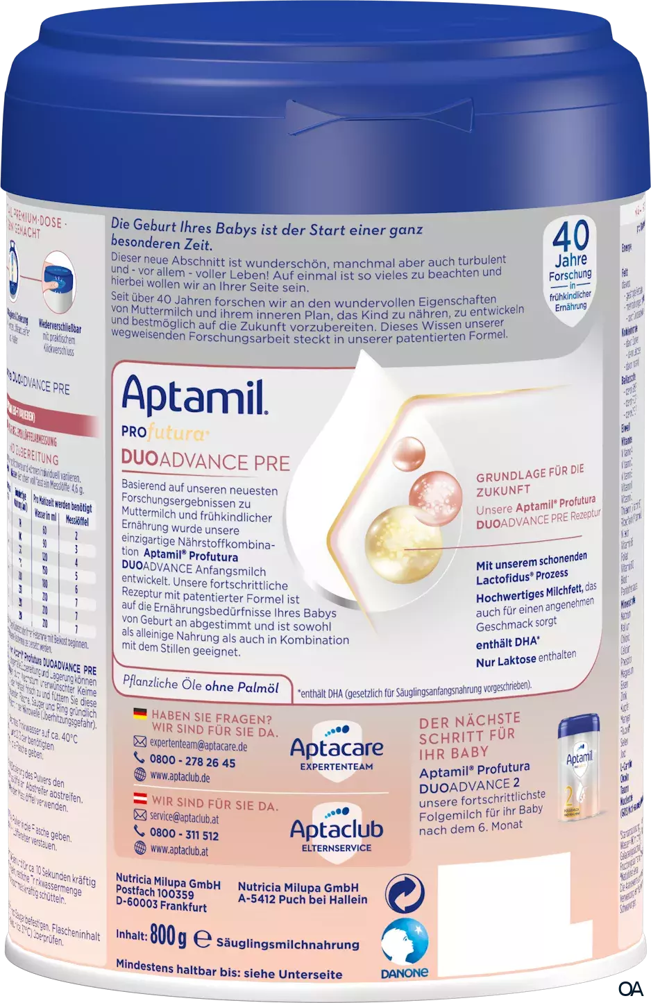 Das Aptamil Profutura Duoadvance Pre Anfangsmilch Pulver enthält unsere fortschrittlichste Rezeptur mit unserem schonenden Lactofidus® Prozess. Von Geburt an und auch ergänzend zum Stillen geeignet.