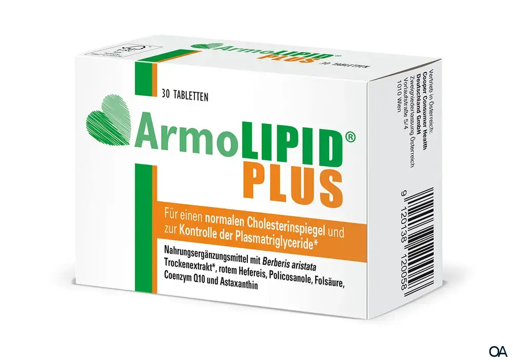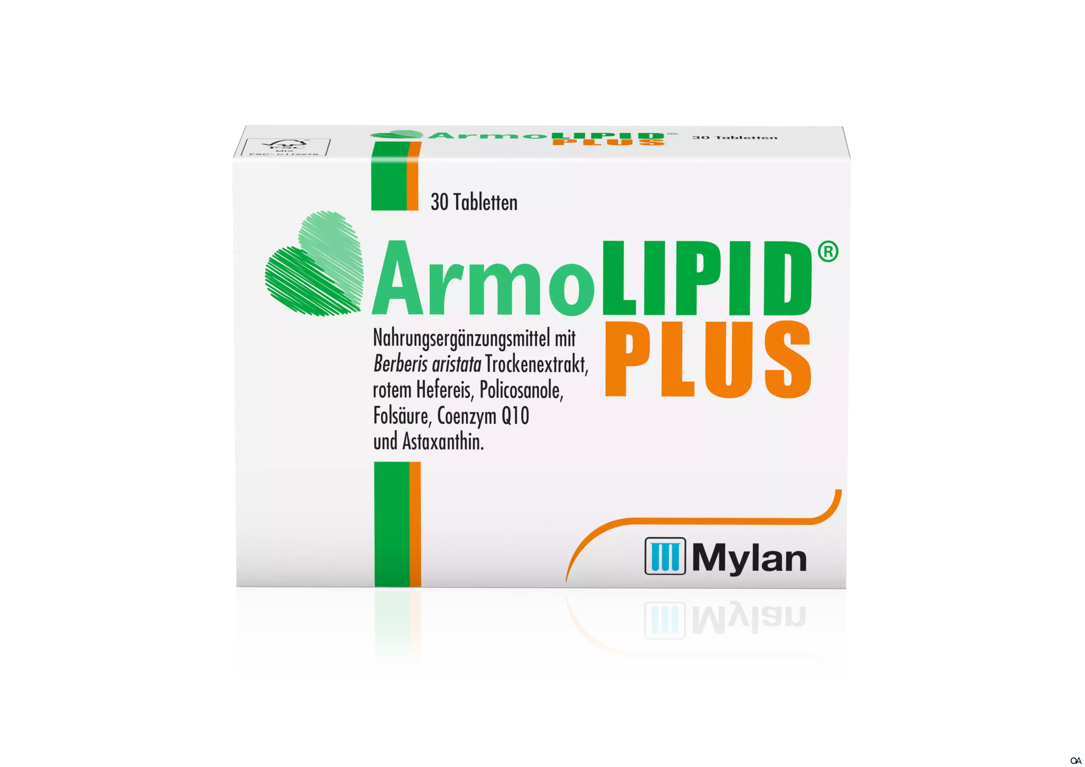 Armolipid Plus Tabletten ist ein pflanzliches Nahrungsergänzungsmittel mit Berberin in Berberis aristata Trockenextrakt, rotem Hefereis, Policosanol, Folsäure, Coenzym Q10 und Astaxanthin, für einen normalen Cholesterin- und Triglyceridspiegel im Blut..