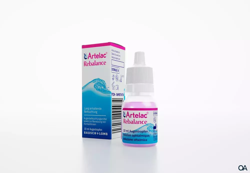 Artelac® Rebalance ist eine klare, rosafarbene Augentropfenlösung, die 0,15 % Natriumhyaluronat, 0,5 % Polyethylenglykol 8000 (PEG 8000), Kaliumchlorid, Calciumchlorid, Magnesiumchlorid, Natriumchlorid, Vitamin B12, Wasser für Injektionszwecke, Borsäure und Oxyd® (ein sanftes Konservierungsmittel, das an der Augenoberfläche in Wasser, Sauerstoff und Salz umgewandelt wird) enthält. Das Produkt kann nach dem ersten Öffnen 2 Monate lang verwendet werden.