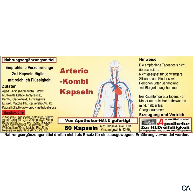 Entdecken Sie die Kraft der Natur! Unsere Arterio Kombi Kapseln unterstützen Ihren gesunden Lebensstil mit einer einzigartigen Formel aus Aged Garlic Extrakt, Ashwagandha, Bambusblatt, MCT, Resveratrol und Vitamin K2. Ideal als tägliche Ergänzung.