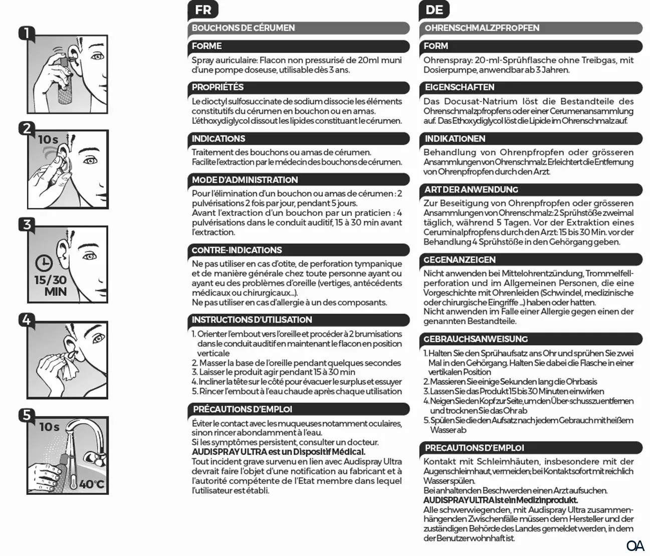 - Audispray Ultra vereint zwei Tenside: Docusat-Natrium (zersetzt die Bestandteile des Ohrenschmalzpfropfens) und Ethoxydiglycol (löst die Lipide im Pfropfen auf).