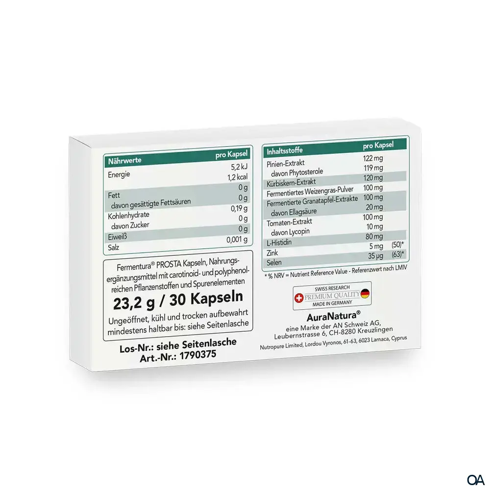 - Zutaten: Pinien-Extrakt (98 % Phytosterole), Kapselhülle Hydroxypropylmethylcellulose, Kürbiskern-Extrakt, fermentierter Granatapfel-Extrakte-Mix (13 %), Tomaten-Extrakt (13 %), fermentiertes Weizengras-Pulver (13 %), L-Histidin, Selenhefe, Zinkcitrat. Enthält Weizen.