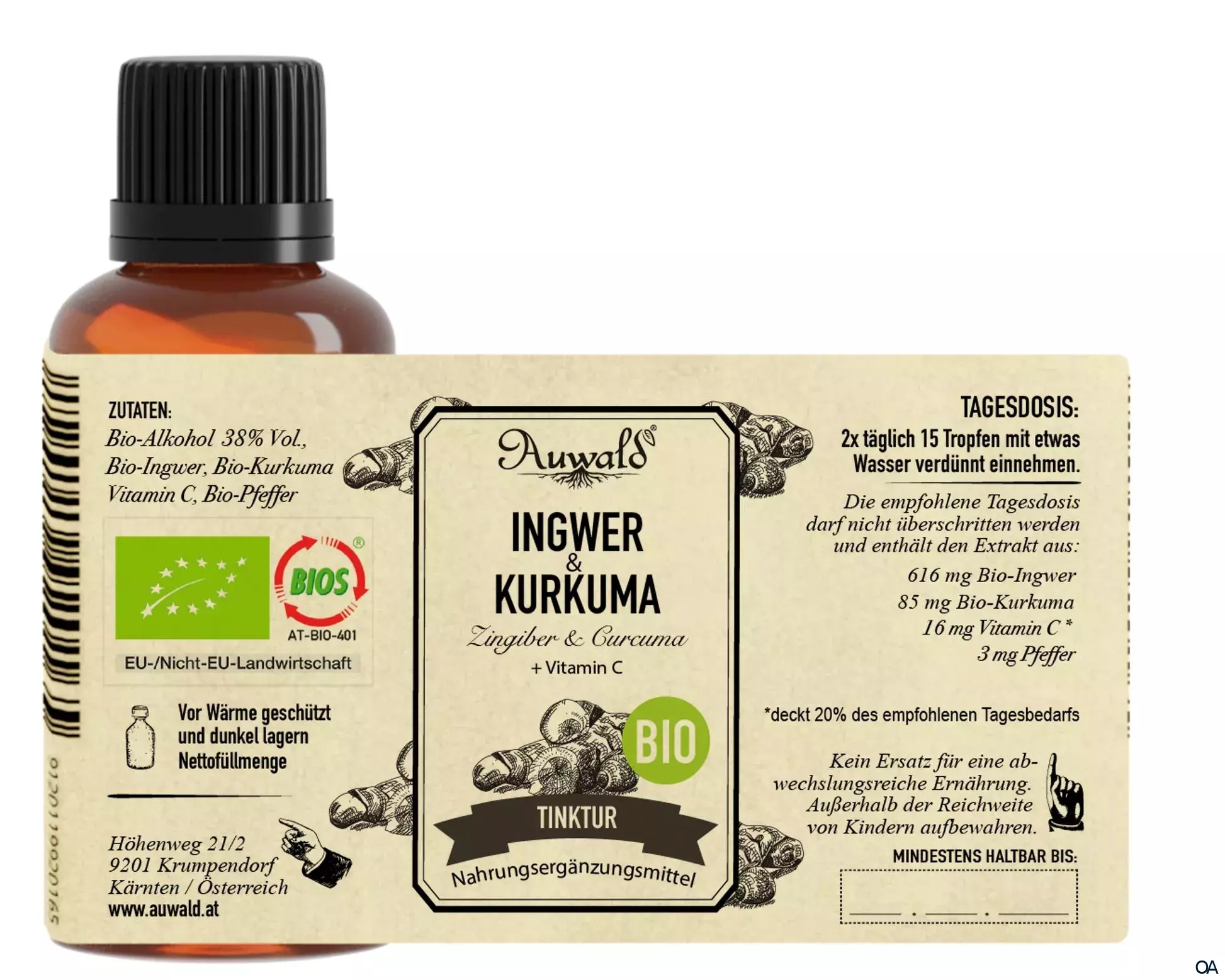 - Zutaten: Bio-Alkohol 38% Vol., Bio-Ingwer, Bio-Kurkuma, Vitamin C, Bio-Pfeffer.