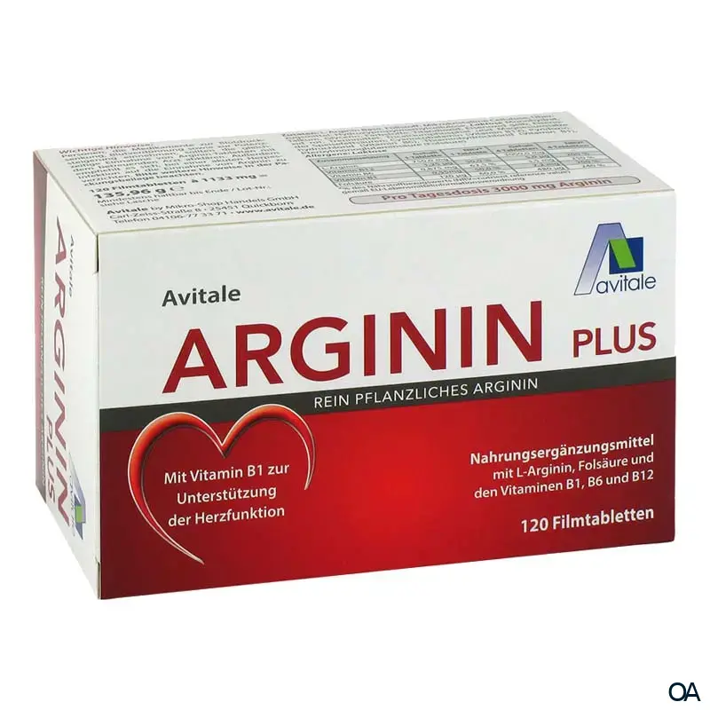 - Avitale Arginin plus Filmtabletten enthalten qualitativ hochwertige L-Arginin-Base, gewonnen aus rein pflanzlichen Rohstoffen, welche sinnvoll mit Folsäure und den Vitaminen B1, B6 und B12 kombiniert wurde.