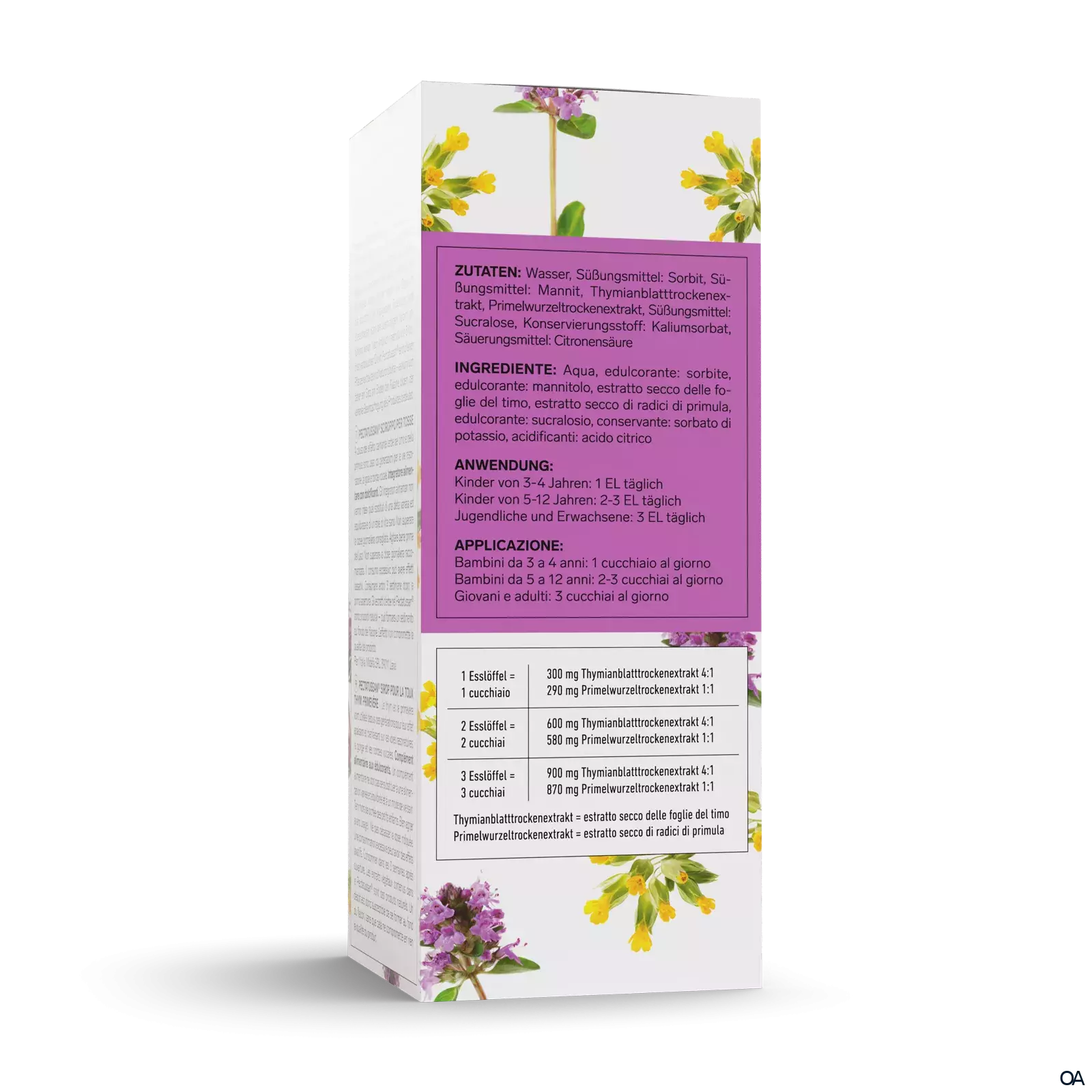 - 1 Esslöffel enthält 300mg Thymianblatttrockenextrakt 4:1, 290mg Primelwurzeltrockenextrakt 1:1.