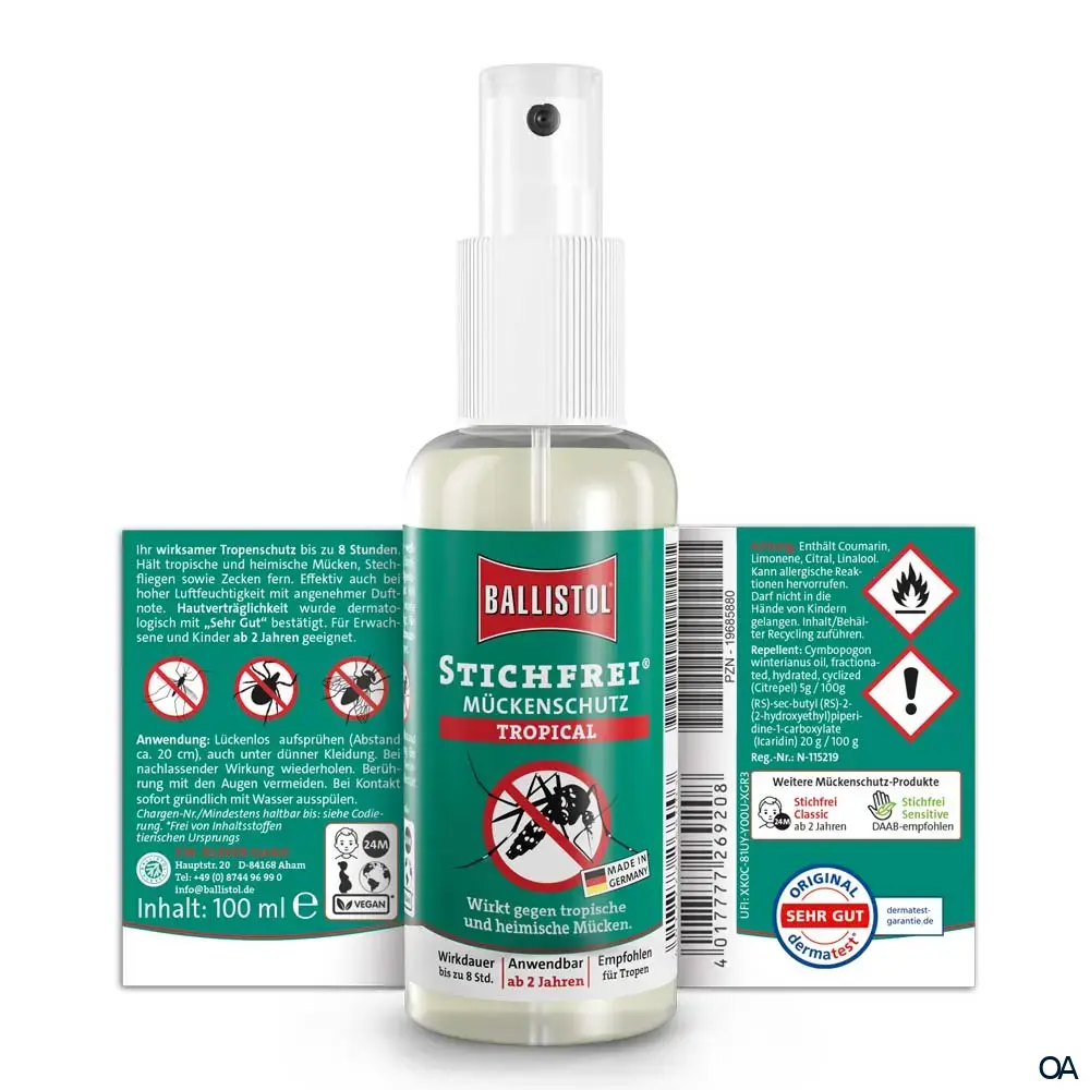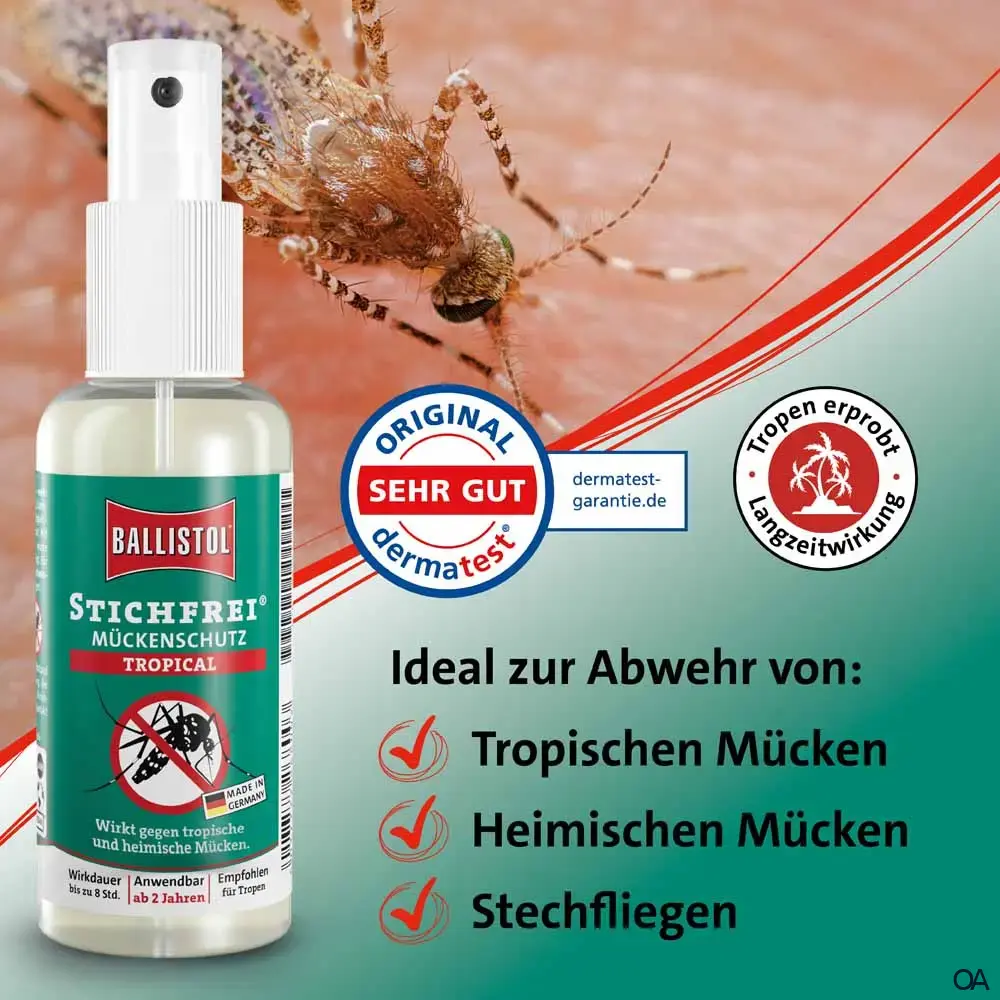Ob Regenwald, Safari oder Strandurlaub – in tropischen Regionen sind Mücken und Zecken nicht nur lästig, sondern können auch gefährliche Krankheiten übertragen. Mit Ballistol Stichfrei Tropical bist du bis zu 8 Stunden lang zuverlässig geschützt – ganz ohne DEET, aber mit hochwirksamem Icaridin (20 %) und Citrepel (5 %).