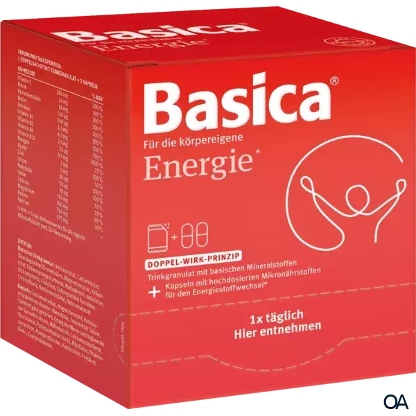 Basica® Energie Granulat + Kapseln Doppel-Sachtes sind ein Nahrungsergänzungsmittel mit basischen Mineralstoffen, Spurenelementen und Vitaminen. Mit Süßungsmittel. Zur Unterstützung des normalen Energiestoffwechsels.