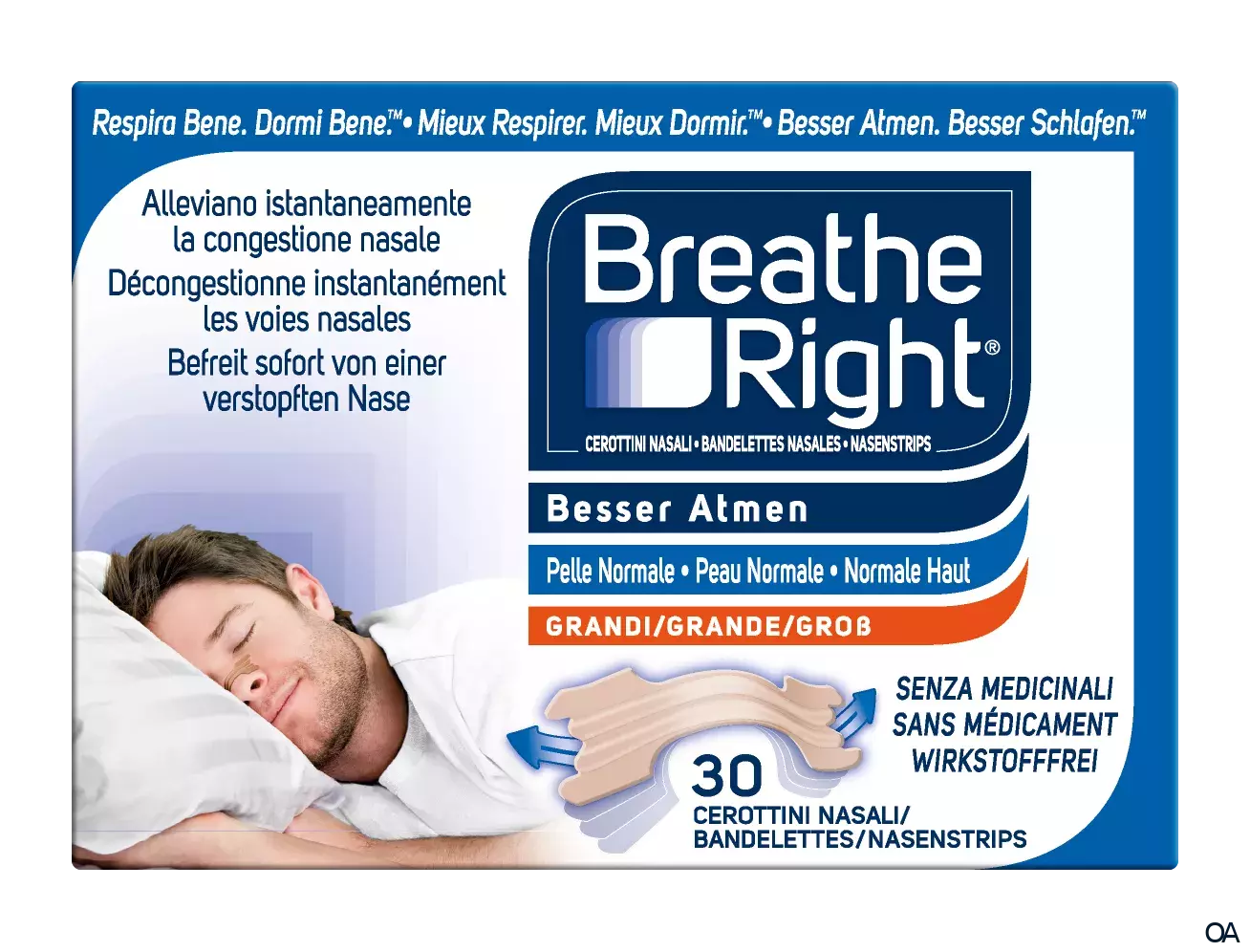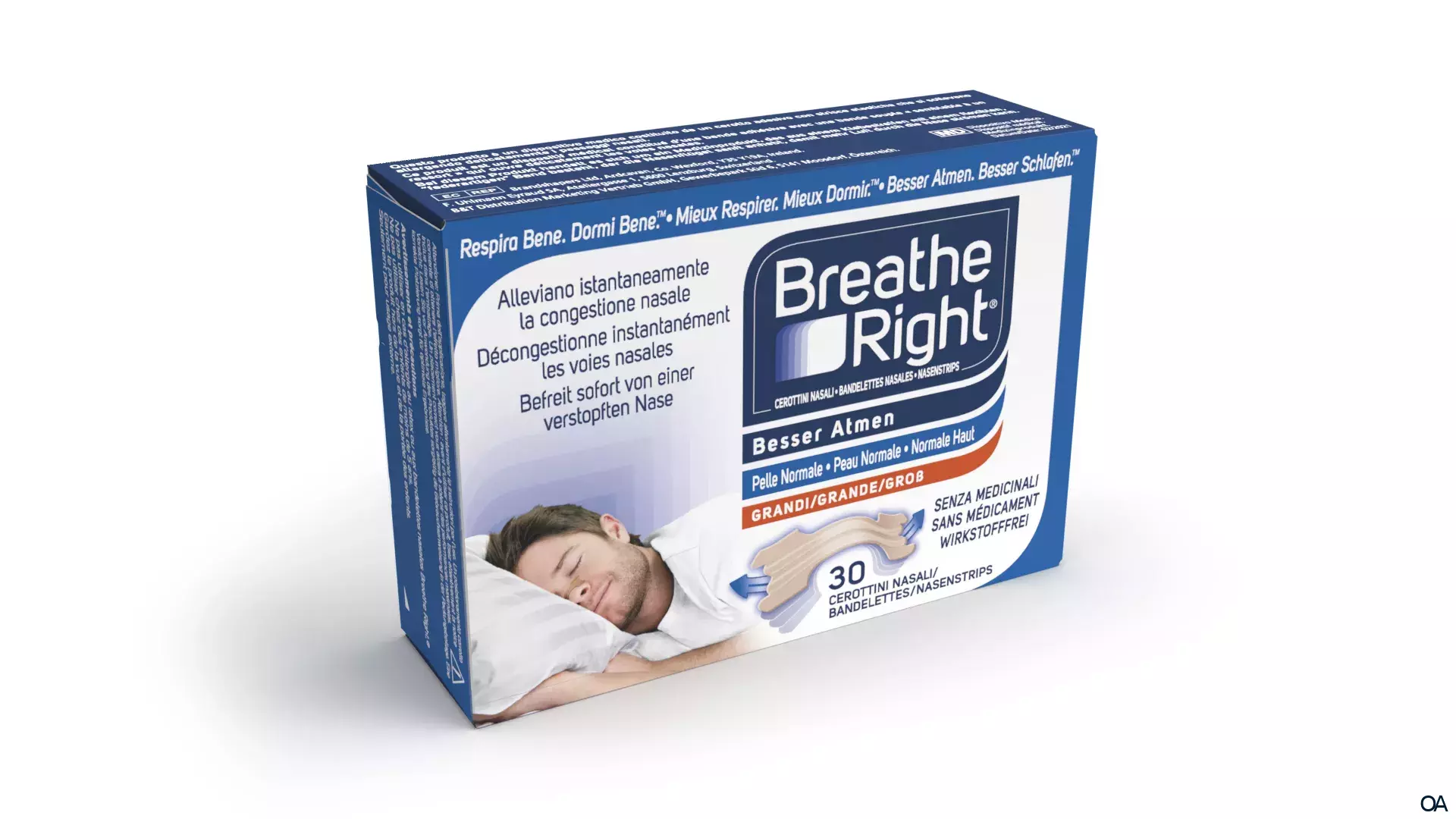 Breathe Right® Nasenpflaster sind flexible, federartige Bänder, die Ihre Nasenflügel sanft anheben und öffnen, den Luftstrom durch die Nase verbessern und somit das Atmen erleichtern.