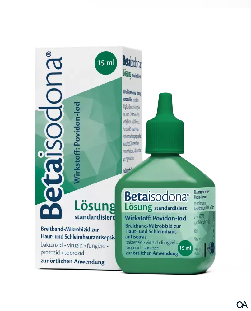 100 ml Betaisodona Lösung standardisiert enthalten 10 g Povidon-Iod-Komplex mit einem Gehalt von 11% verfügbarem Iod.