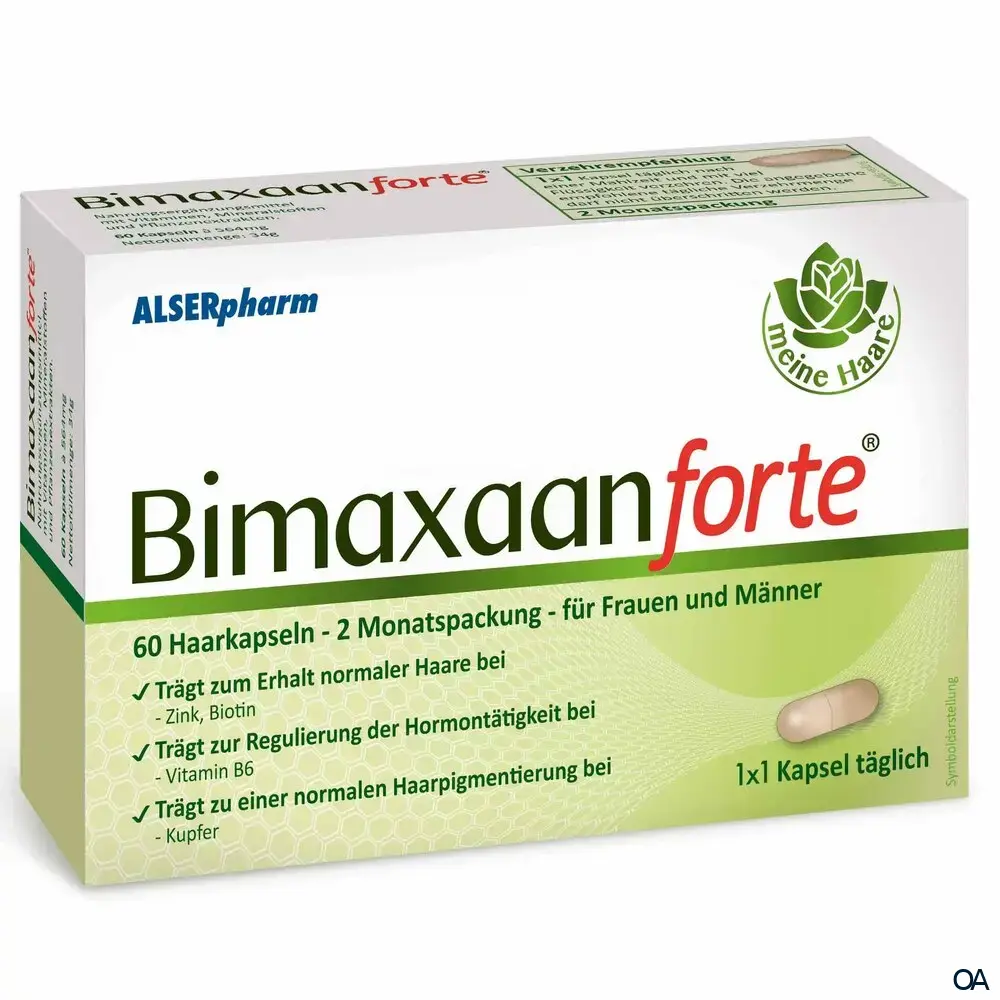 Die Bimaxaan forte® Haarkapseln sind ein Nahrungsergänzungsmittel mit einer speziellen Kombination aus Vitaminen, Mineralstoffe und Pflanzenextrakten, in Zusammenarbeit mit Dermatologen, Pharmazeuten und Ernährungswissenschaftlern entwickelt.
