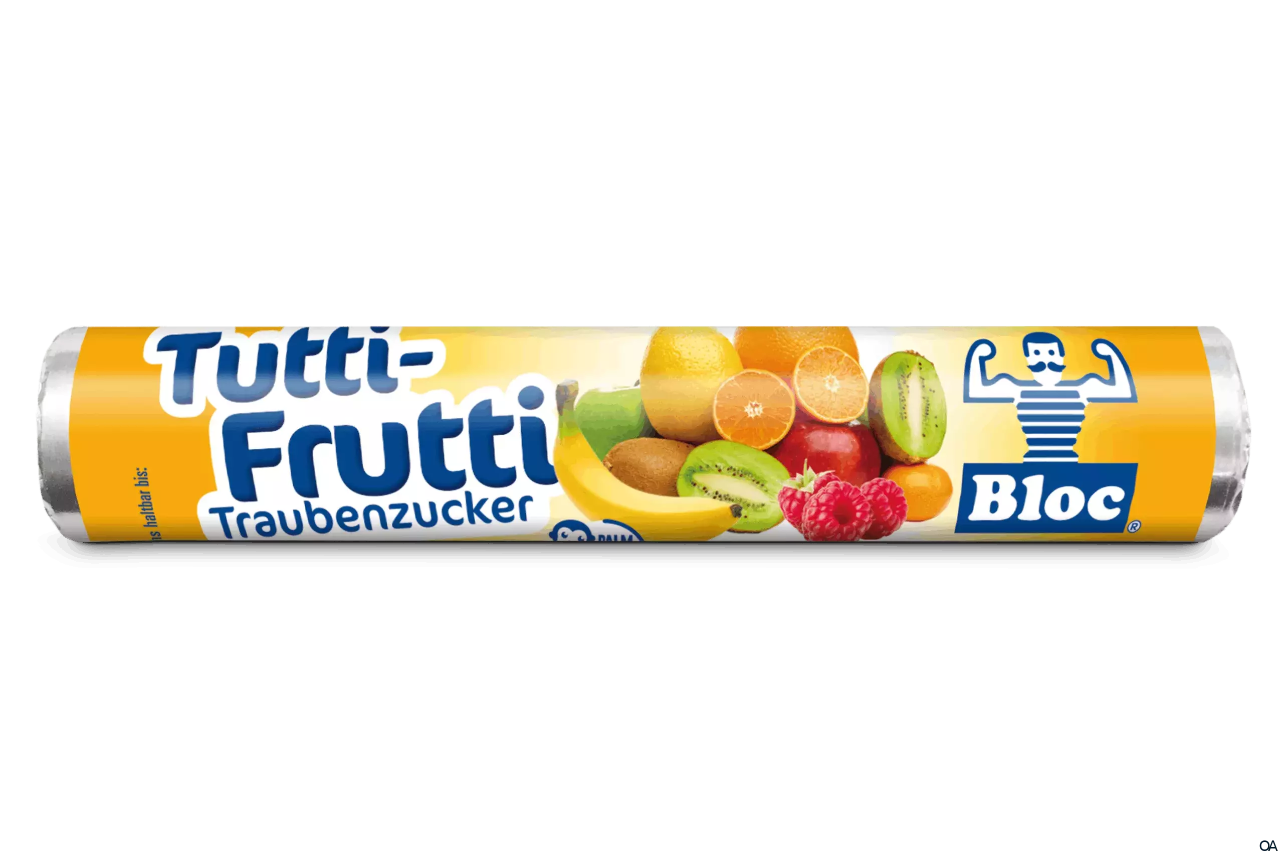 Bloc® Traubenzucker Tutti Frutti ist der ideale Energiespender für zwischendurch. Mit seinem unvergleichlich weichen Schmelz und einzigartigen Tutti-Frutti-Geschmack bringt er den Körper schnell wieder in Schwung. Ob beim Sport, in der Schule usw.