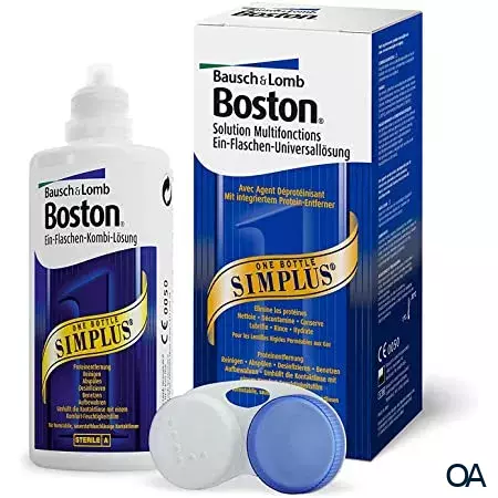 Boston® SIMPLUS™-Kombi-Lösung ist eine innovative Ein-Flaschen-Lösung zum Reinigen, Desinfizieren und Aufbewahren von formstabilen, sauerstoffdurchlässigen Kontaktlinsen. Sie ist für sauerstoffdurchlässige Fluorsiliconacrylat- und Siliconacrylat-Kontaktlinsen zugelassen. Boston® SIMPLUS™-Kombi-Lösung entfernt Proteine und Lipide von der Linsenoberfläche und hilft, hartnäckige Ablagerungen auf der Kontaktlinse zu vermeiden. Diese Lösung eignet sich gleichermaßen auch zum Abspülen von Kontaktlinsen, indem sie gelöste Ablagerungen von der Linsenoberfläche abspült.