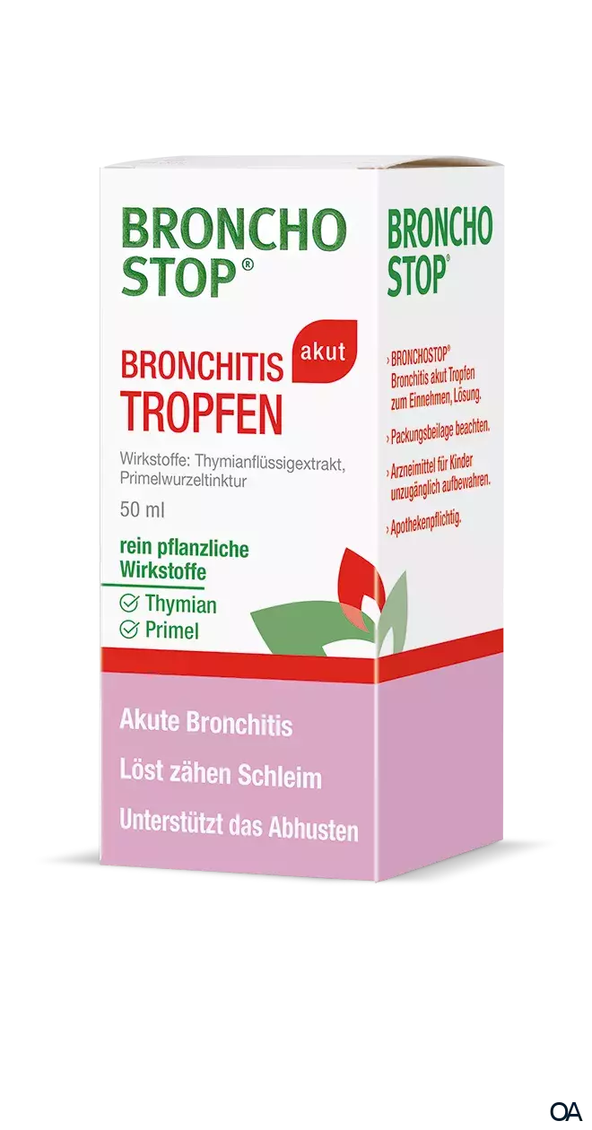 Bronchostop Bronchitis akut Tropfen ist ein pflanzliches Arzneimittel mit Thymian und Primel zur Behandlung von produktivem Husten bei akuter Bronchitis im Rahmen einer Erkältung. Löst zähen Schleim und beruhigt den Husten.