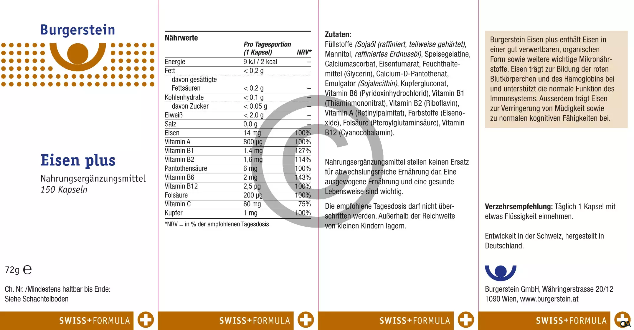 - Nährwerte Pro Tagesportion (1 Tbl. ETD*): Eisen 14 mg (100%), Vitamin B1 1.4 mg (127%), Vitamin B2 1.6 mg (114%), Vitamin B6 2 mg (143%), Vitamin B12 2.5 µg (100%), Pantothensäure 6 mg (100%), Folsäure 200 μg (100%), Vitamin C 60 mg (75%), Kupfer 1 mg (100%), Vitamin A 800 μg (100%) *NRV = in % der empfohlenen Tagesdosis