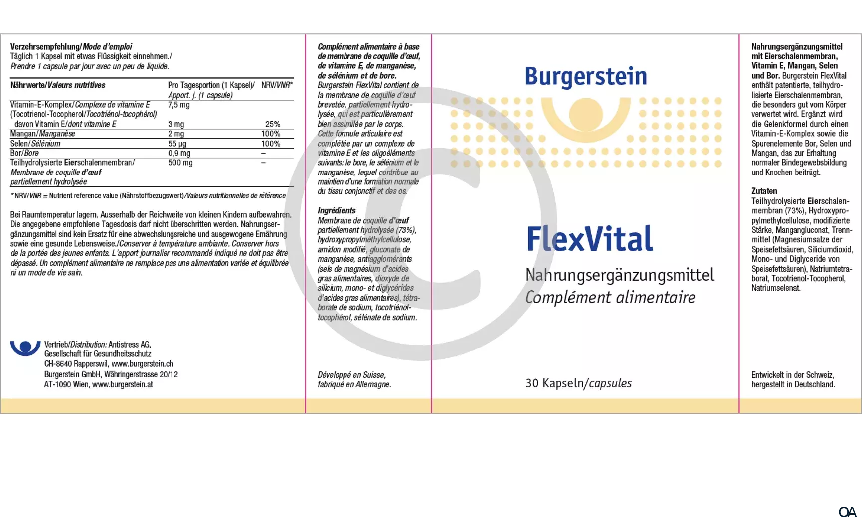 Burgerstein FlexVital enthält patentierte, teilhydrolysierte Eierschalenmembran, die besonders gut vom Körper verwertet wird.