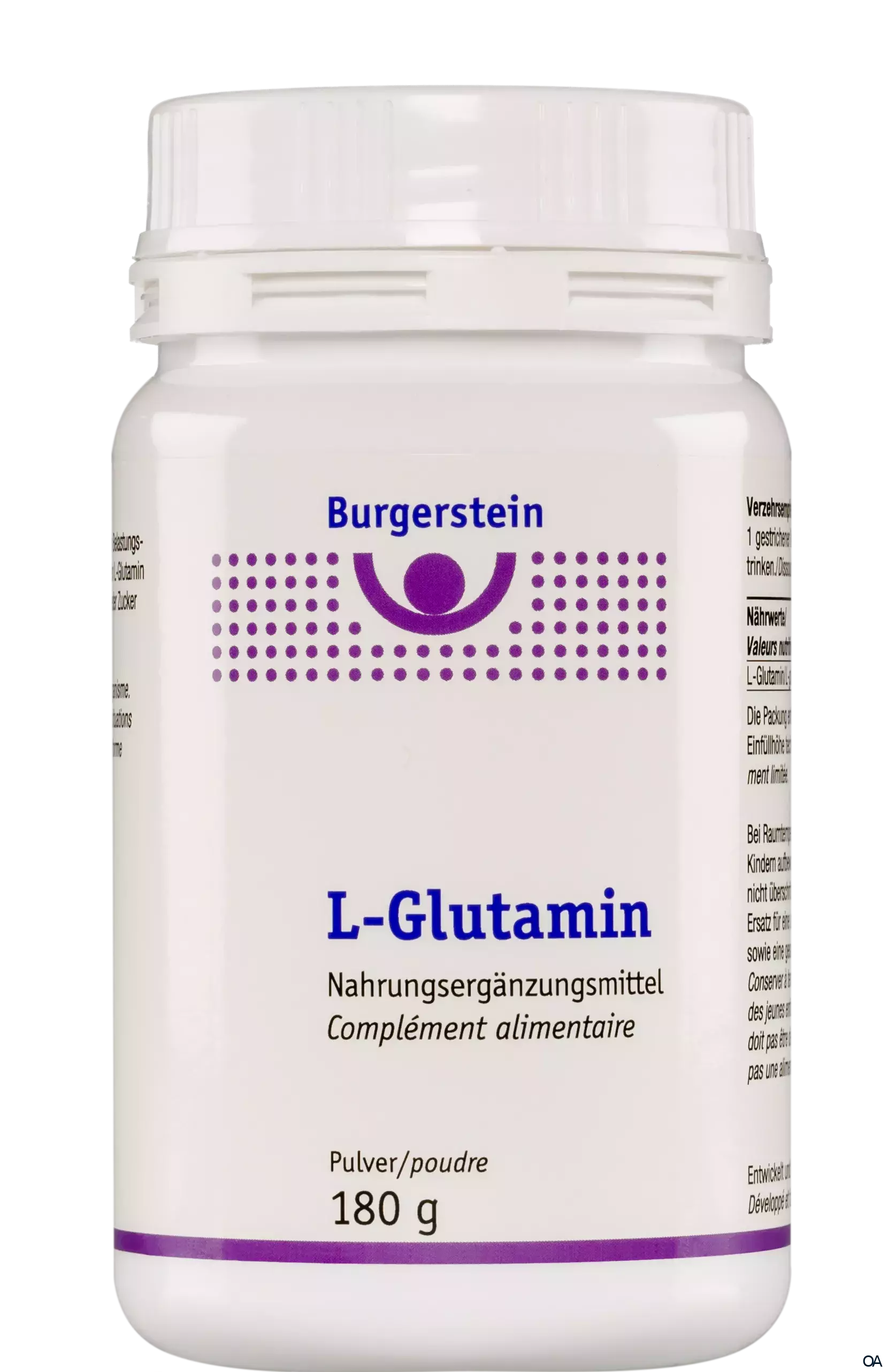 Burgerstein L-Glutamin Pulver ist ein Nahrungsergänzungsmittel. L-Glutamin ist eine für den Körper wichtige Aminosäure. In Muskelzellen ist L-Glutamin die am häufigsten vorkommende, freie Aminosäure, für Darmzellen dient L-Glutamin als Hauptenergiequelle.