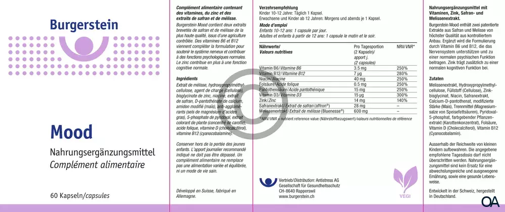 - Mikronährstoff Pro Tagesportion (= 2 Kapseln ETD*): Vitamin B6 3,5 mg (250%), Vitamin B12 7µg (280%), Niacin 40 mg (250%), Folsäure 0,5 mg (50%), Pantothensäure 15 mg (250%), Vitamin D3 15µg (300%), Zink 14 mg (140%), Safranextrakt (affron®) 28 mg (-), Melissenextrakt (Bluenesse®) 600 mg (-) *ETD = Empfohlende Tagesdosis