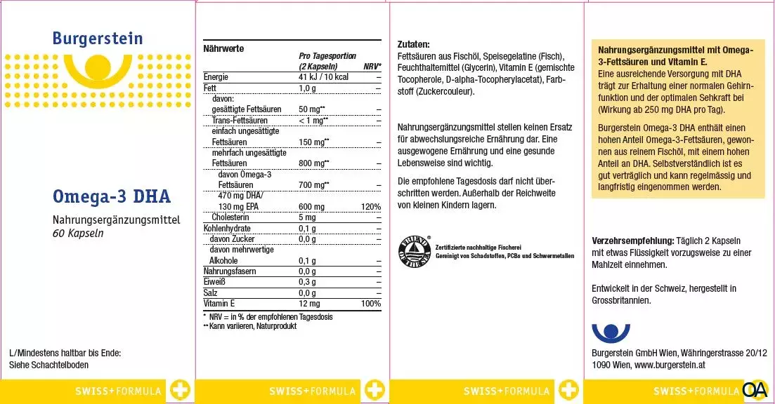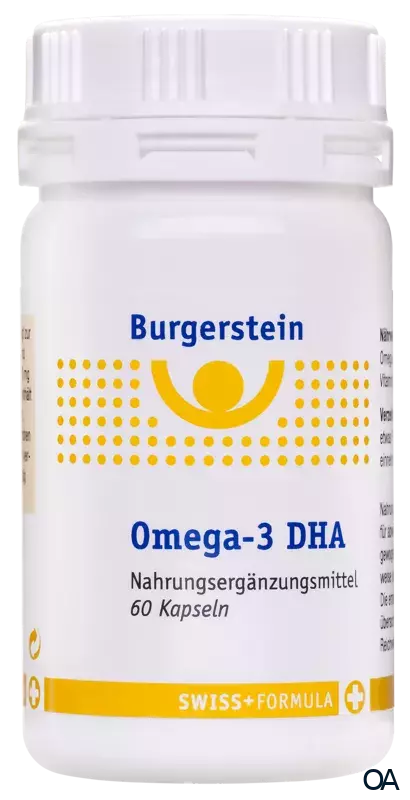 Eine ausreichende Versorgung mit DHA trägt zur Erhaltung einer normalen Gehirnfunktion und der optimalen Sehkraft bei (Wirkung ab 250 mg DHA pro Tag). Burgerstein Omega-3 DHA enthält einen hohen Anteil Omega-3-Fettsäuren, gewonnen aus reinem Fischöl, mit einem hohen Anteil an DHA. Selbstverständlich ist es gut verträglich und kann regelmäßig und langfristig eingenommen werden.