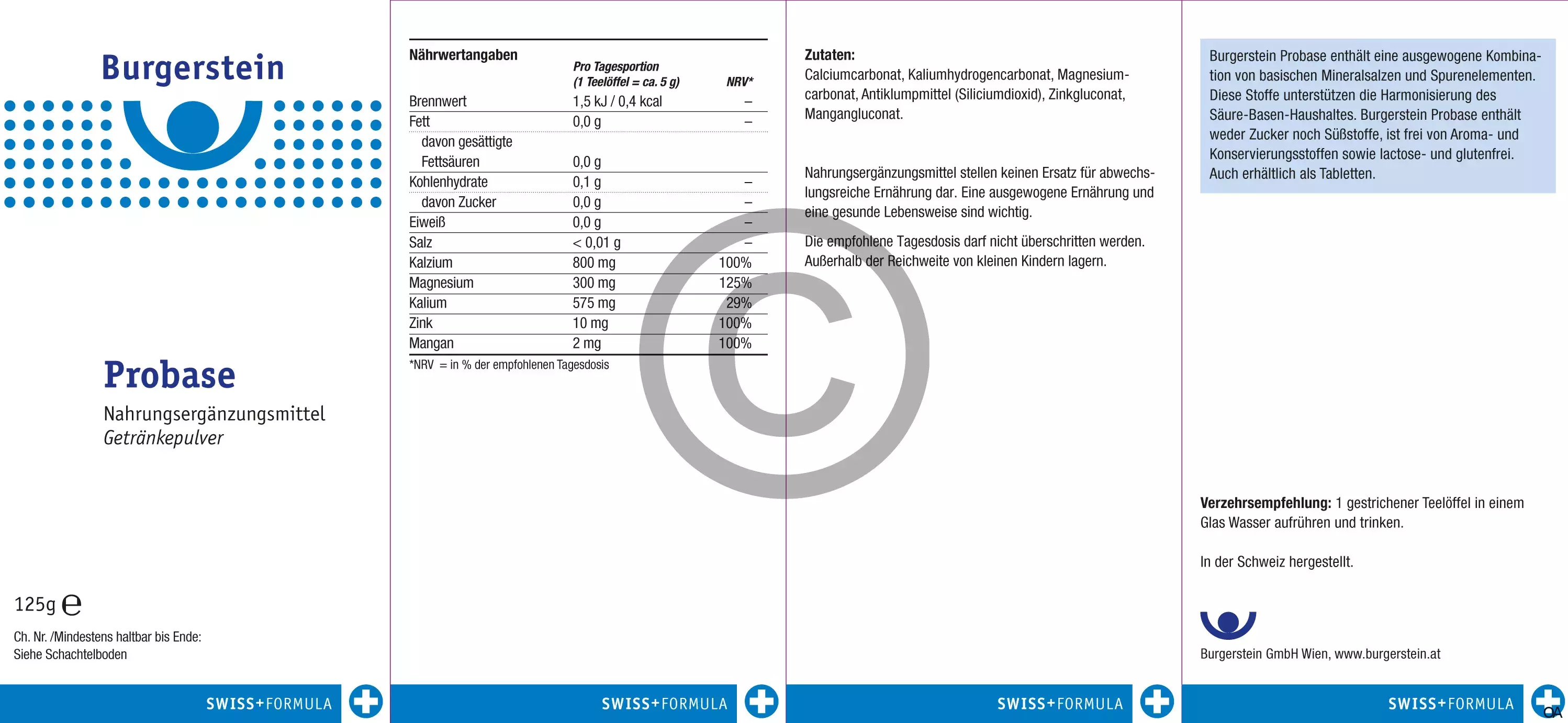 Burgerstein Probase ist ein modernes Basenpräparat mit einer ausgewogenen Kombination von Mineralstoffen (Kalzium, Magnesium, Kalium) und Spurenelementen (Zink, Mangan). Das enthaltene Zink trägt zu einem normalen Säure-Basenstoffwechsel bei. Aufgrund seiner Zusammensetzung eignet sich Burgerstein Probase außerdem ideal als Mineralstoffpräparat. Burgerstein Probase ist ein leicht lösliches, geschmackneutrales Pulver, das weder Zucker noch Süßstoffe enthält. Auch erhältlich in Form von Tabletten.